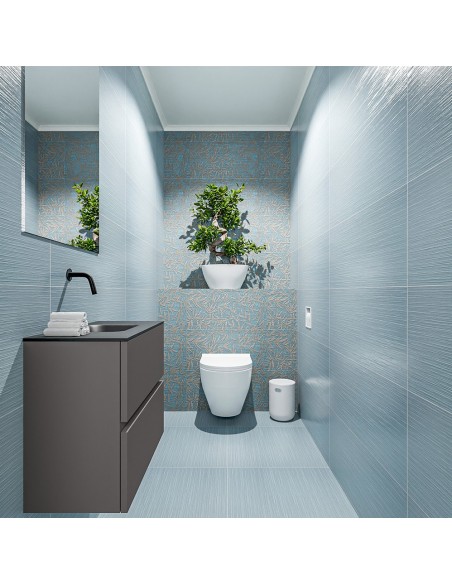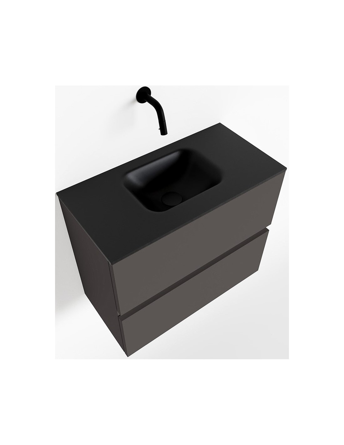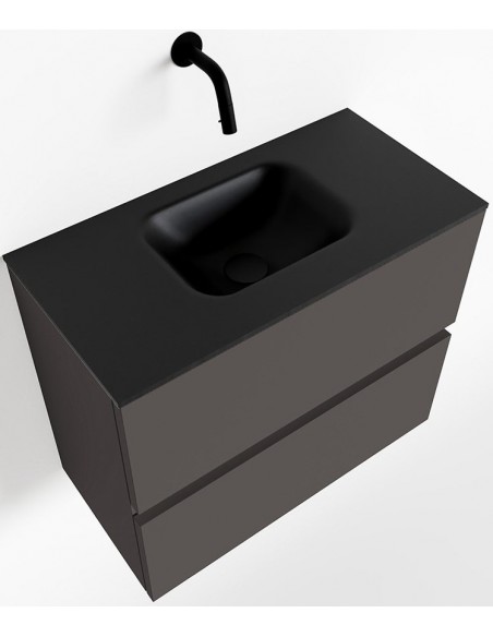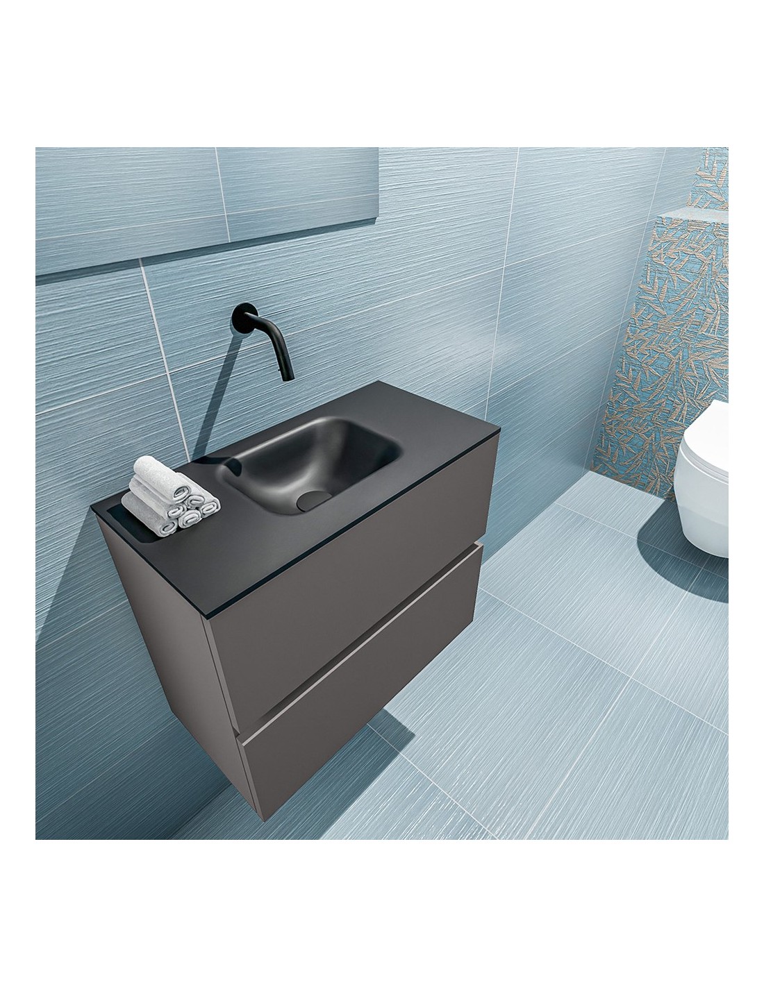 ADA Komplet badmiljø med centreret håndvask til vægmonteret armatur. Badmiljøet kommer med 2 skuffer med fuldt udtræk, og er fremstillet i MDF. Håndvasken er fremstillet i sort solid surface. Badmiljøet måler 60 x 50 cm i bredde og højde. Det viste armatur medfølger ikke i sættet.