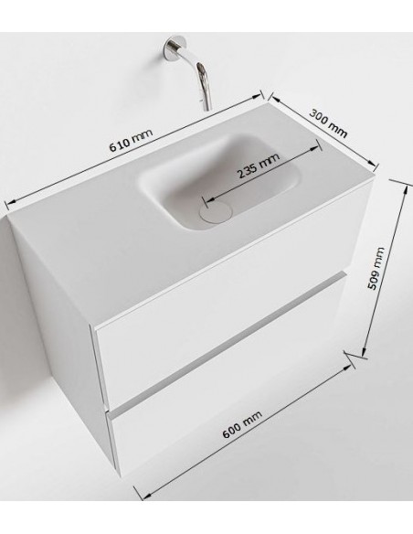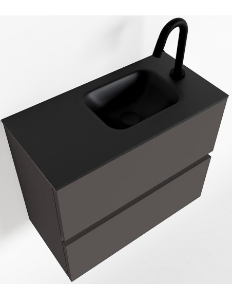 ADA Komplet badmiljø med højrevendt håndvask til bordmonteret armatur. Badmiljøet kommer med 2 skuffer med fuldt udtræk, og er fremstillet i MDF. Håndvasken er fremstillet i sort solid surface. Badmiljøet måler 60 x 50 cm i bredde og højde. Det viste armatur medfølger ikke i sættet.