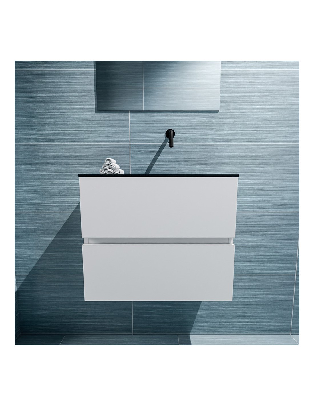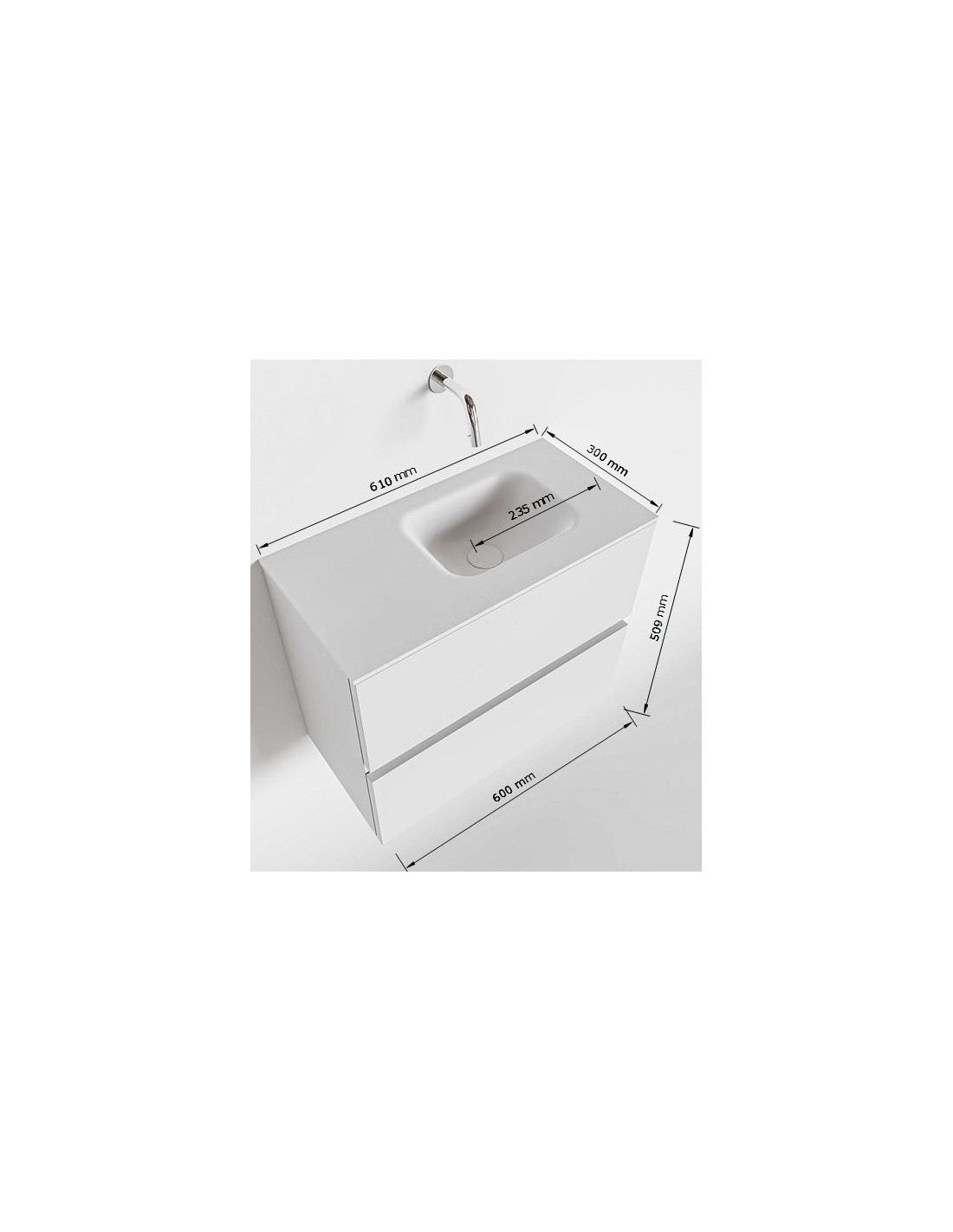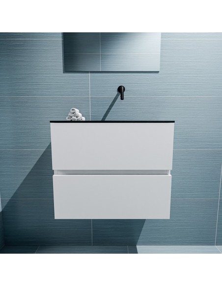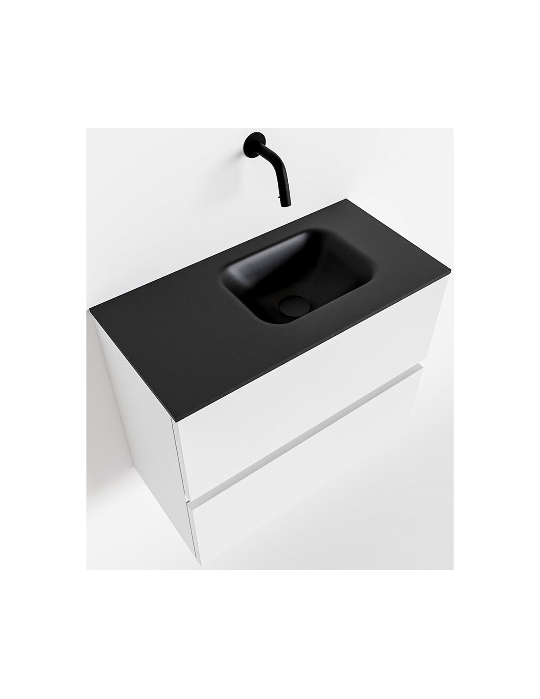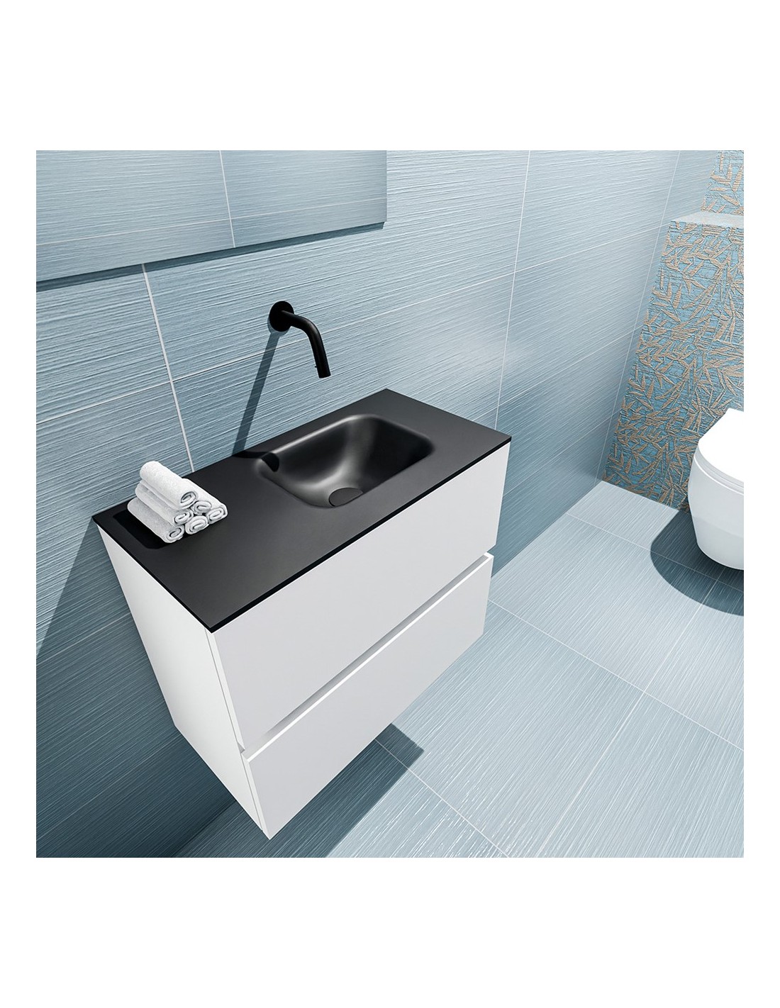 ADA Komplet badmiljø med højrevendt håndvask til vægmonteret armatur. Badmiljøet kommer med 2 skuffer med fuldt udtræk, og er fremstillet i MDF. Håndvasken er fremstillet i sort solid surface. Badmiljøet måler 60 x 50 cm i bredde og højde. Det viste armatur medfølger ikke i sættet.