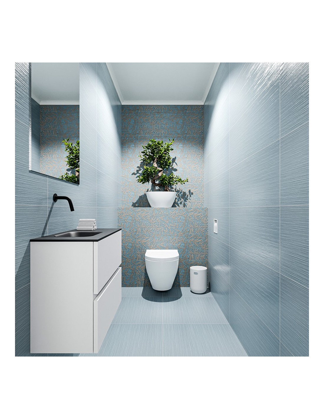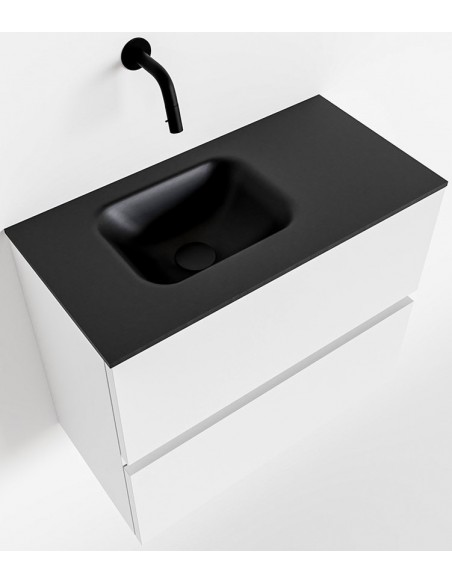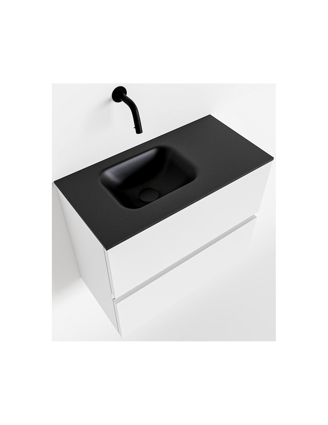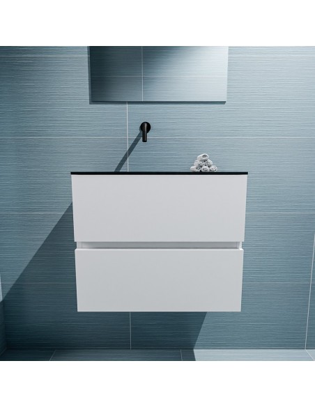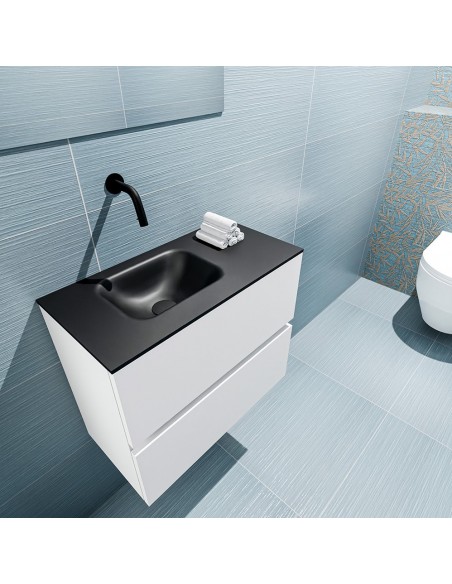 ADA Komplet badmiljø med venstrevendt håndvask til vægmonteret armatur. Badmiljøet kommer med 2 skuffer med fuldt udtræk, og er fremstillet i MDF. Håndvasken er fremstillet i sort solid surface. Badmiljøet måler 60 x 50 cm i bredde og højde. Det viste armatur medfølger ikke i sættet.