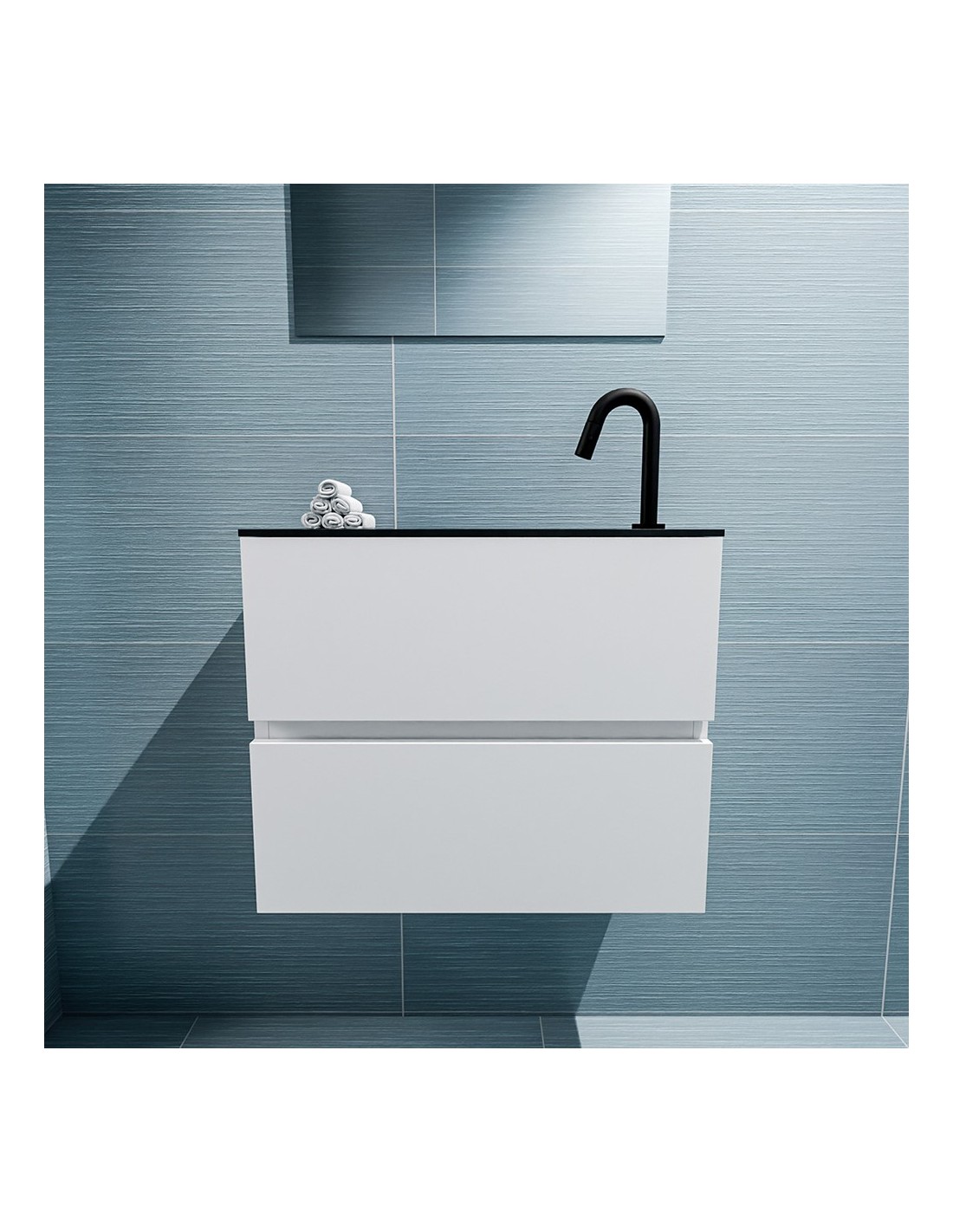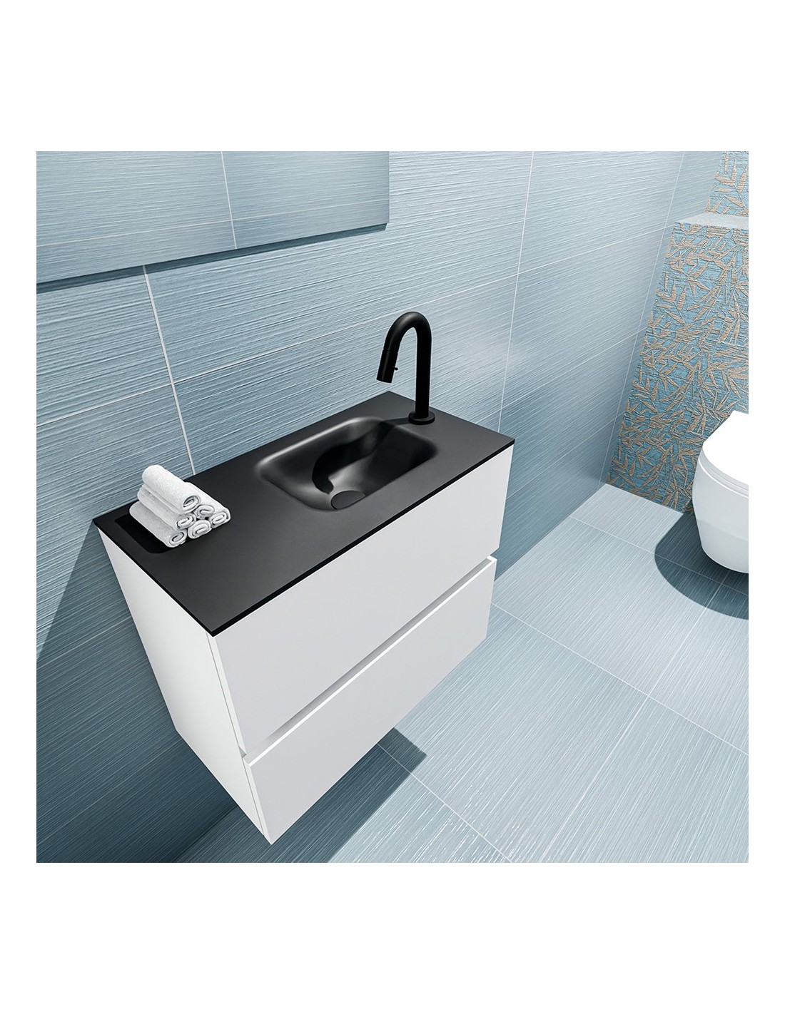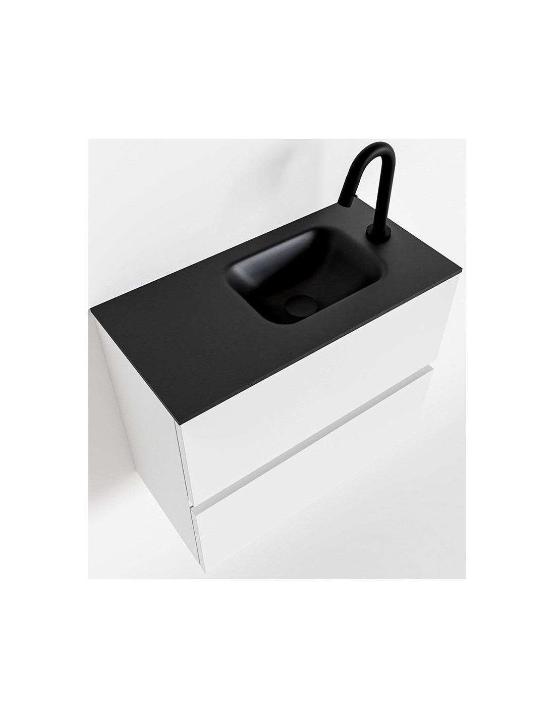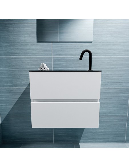 ADA Komplet badmiljø med højrevendt håndvask til bordmonteret armatur. Badmiljøet kommer med 2 skuffer med fuldt udtræk, og er fremstillet i MDF. Håndvasken er fremstillet i sort solid surface. Badmiljøet måler 60 x 50 cm i bredde og højde. Det viste armatur medfølger ikke i sættet.