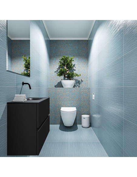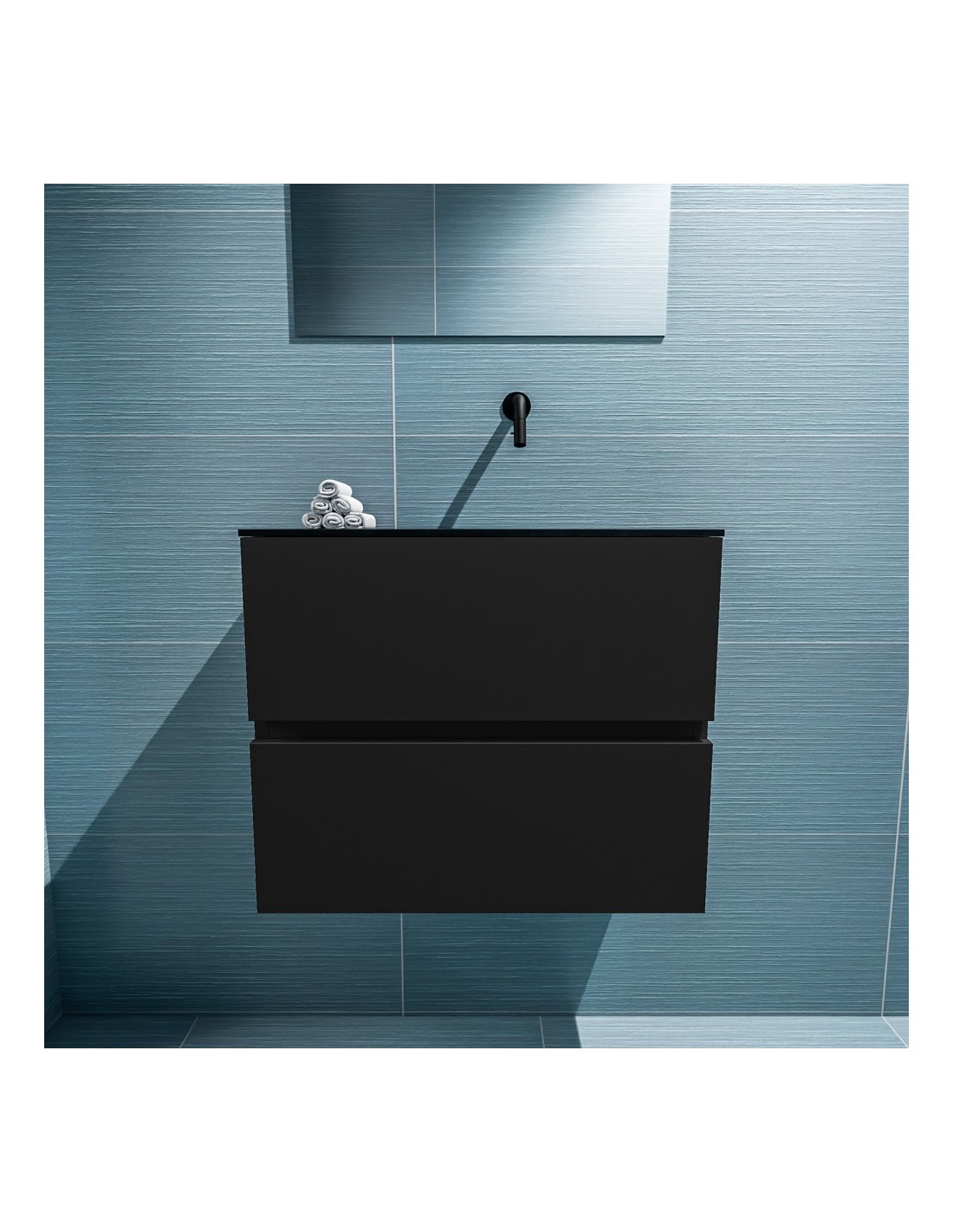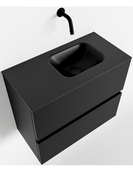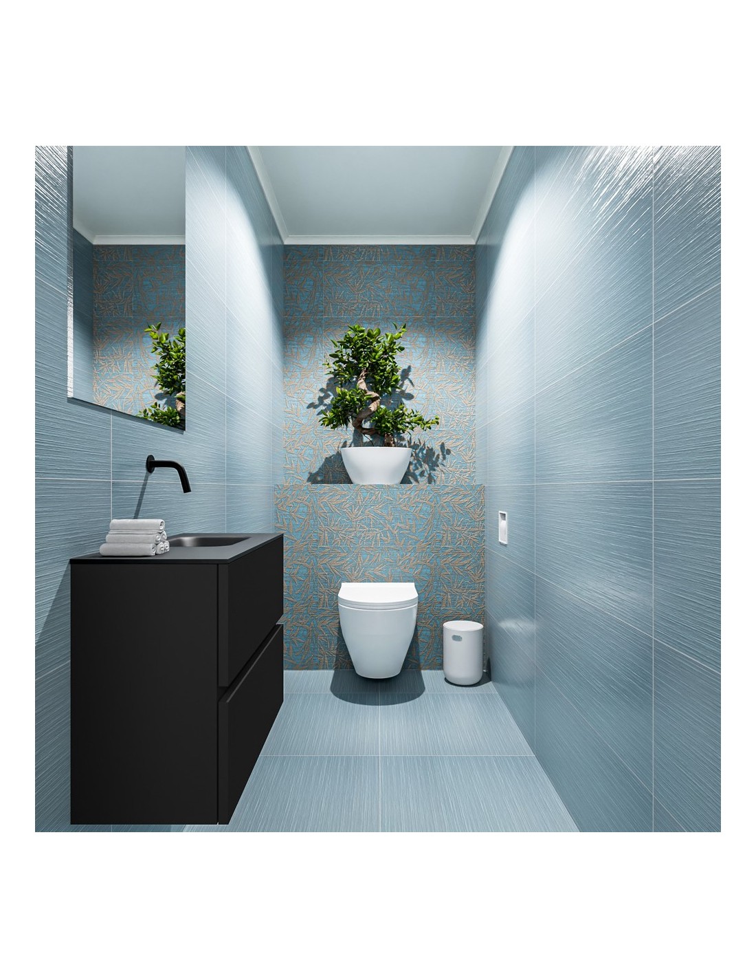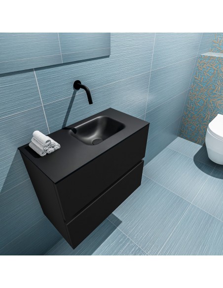 ADA Komplet badmiljø med højrevendt håndvask til vægmonteret armatur. Badmiljøet kommer med 2 skuffer med fuldt udtræk, og er fremstillet i MDF. Håndvasken er fremstillet i sort solid surface. Badmiljøet måler 60 x 50 cm i bredde og højde. Det viste armatur medfølger ikke i sættet.