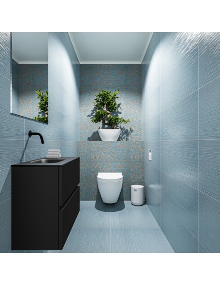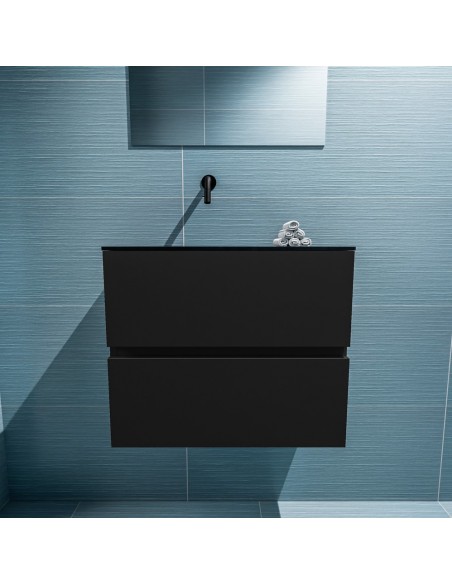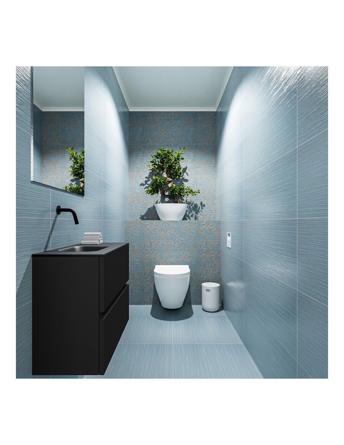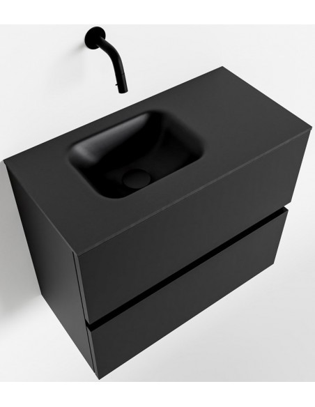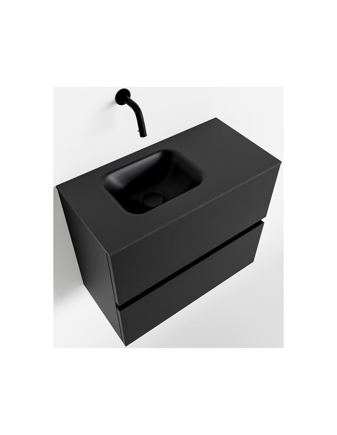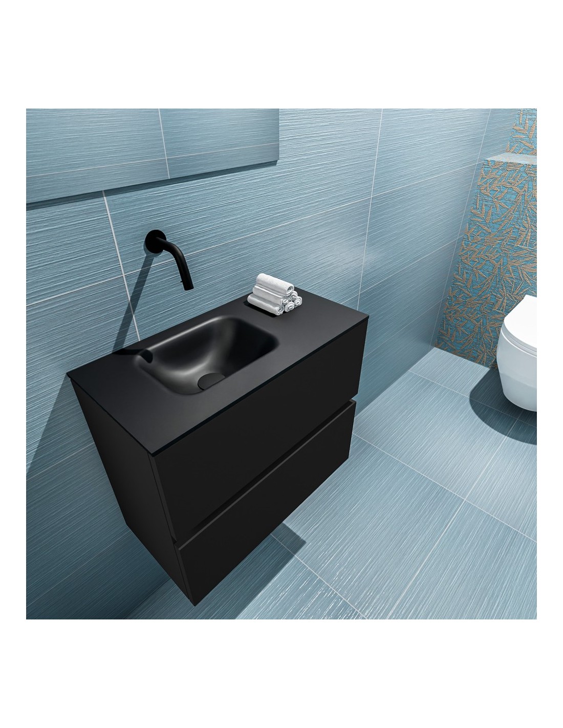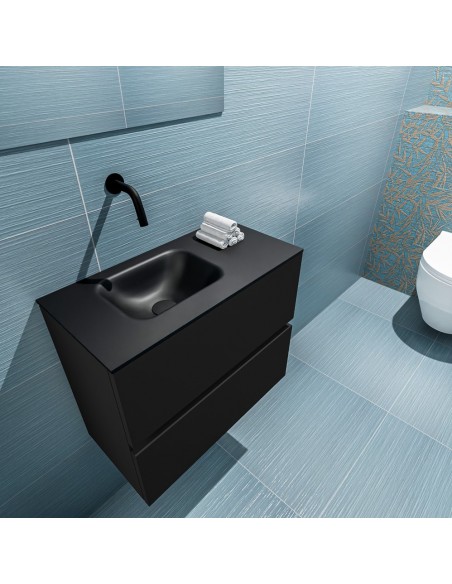 ADA Komplet badmiljø med venstrevendt håndvask til vægmonteret armatur. Badmiljøet kommer med 2 skuffer med fuldt udtræk, og er fremstillet i MDF. Håndvasken er fremstillet i sort solid surface. Badmiljøet måler 60 x 50 cm i bredde og højde. Det viste armatur medfølger ikke i sættet.