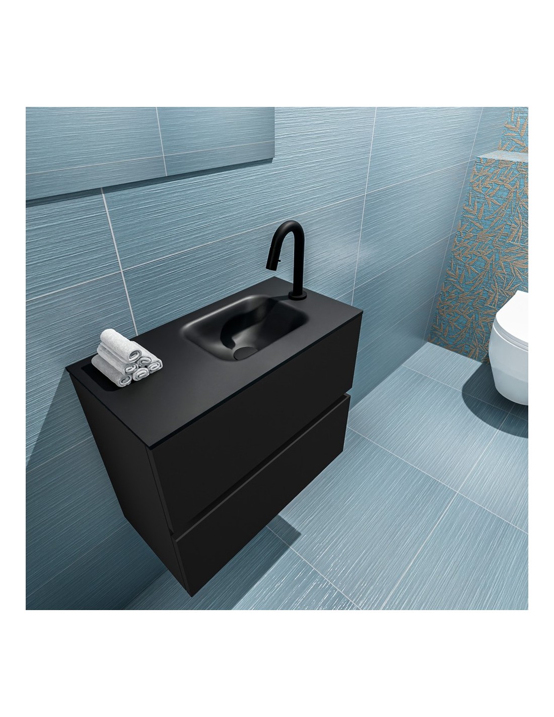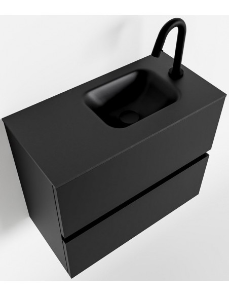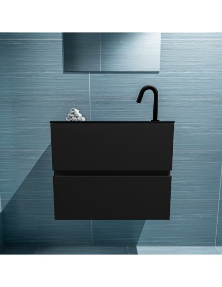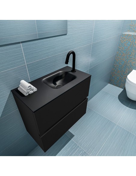 ADA Komplet badmiljø med højrevendt håndvask til bordmonteret armatur. Badmiljøet kommer med 2 skuffer med fuldt udtræk, og er fremstillet i MDF. Håndvasken er fremstillet i sort solid surface. Badmiljøet måler 60 x 50 cm i bredde og højde. Det viste armatur medfølger ikke i sættet.
