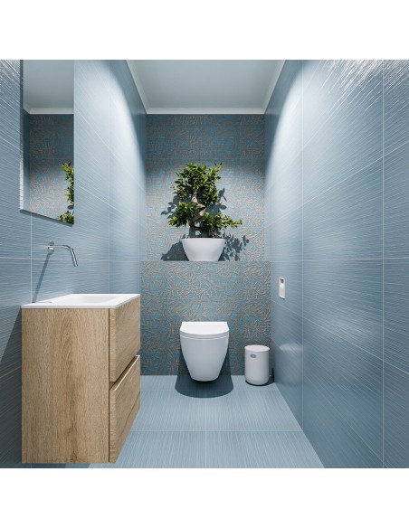 ADA Komplet badmiljø med centreret håndvask til vægmonteret armatur. Badmiljøet kommer med 2 skuffer med fuldt udtræk, og er fremstillet i MDF med design af vasket eg. Håndvasken er fremstillet i talkumsfarvet (mat hvid) solid surface. Badmiljøet måler 40 x 50 cm i bredde og højde. Det viste armatur medfølger ikke i sættet.