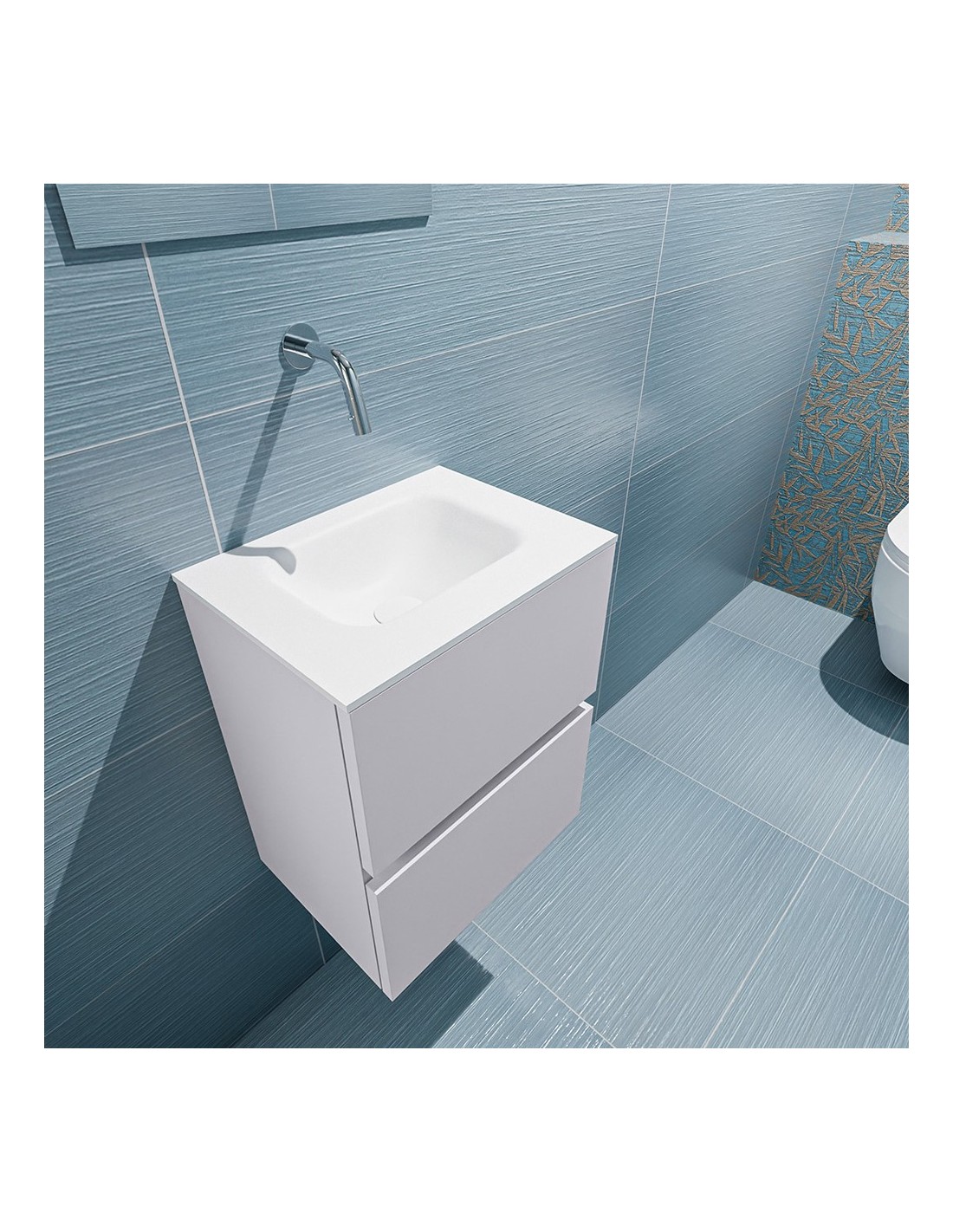 ADA Komplet badmiljø med centreret håndvask til vægmonteret armatur. Badmiljøet kommer med 2 skuffer med fuldt udtræk, og er fremstillet i MDF. Håndvasken er fremstillet i talkumsfarvet (mat hvid) solid surface. Badmiljøet måler 40 x 50 cm i bredde og højde. Det viste armatur medfølger ikke i sættet.