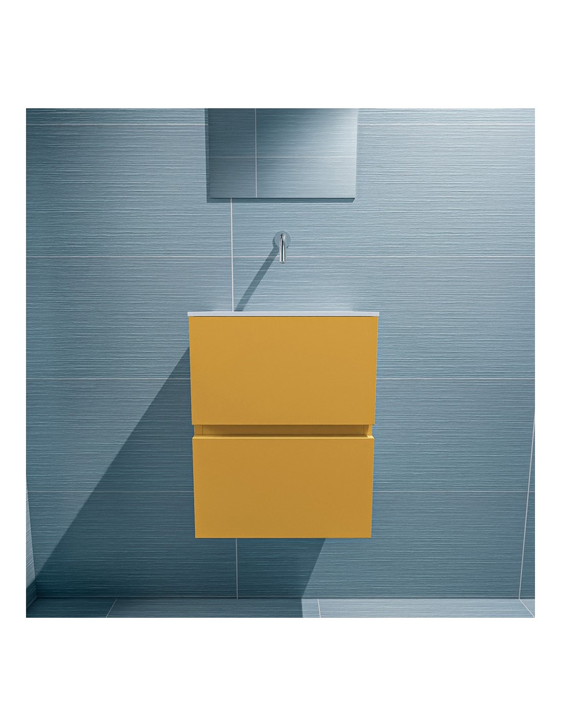 ADA Komplet badmiljø med centreret håndvask til vægmonteret armatur. Badmiljøet kommer med 2 skuffer med fuldt udtræk, og er fremstillet i MDF. Håndvasken er fremstillet i talkumsfarvet (mat hvid) solid surface. Badmiljøet måler 40 x 50 cm i bredde og højde. Det viste armatur medfølger ikke i sættet.