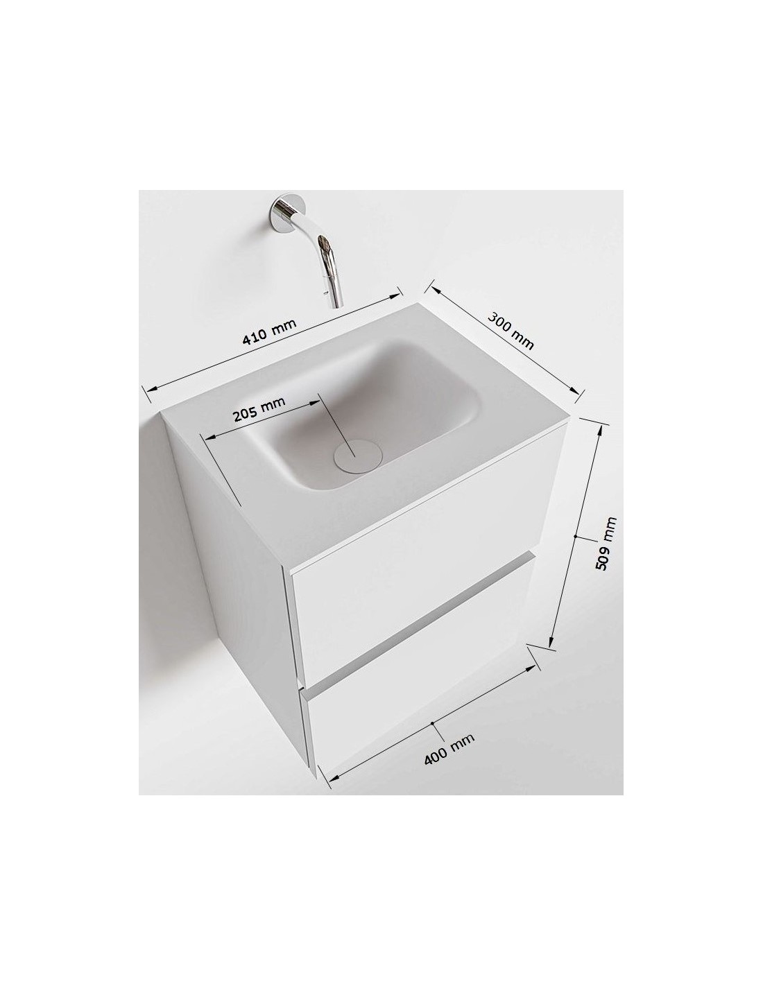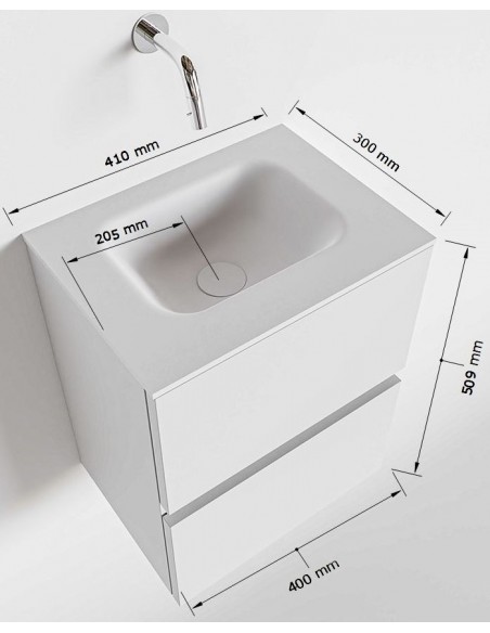 ADA Komplet badmiljø med centreret håndvask til vægmonteret armatur. Badmiljøet kommer med 2 skuffer med fuldt udtræk, og er fremstillet i MDF. Håndvasken er fremstillet i talkumsfarvet (mat hvid) solid surface. Badmiljøet måler 40 x 50 cm i bredde og højde. Det viste armatur medfølger ikke i sættet.