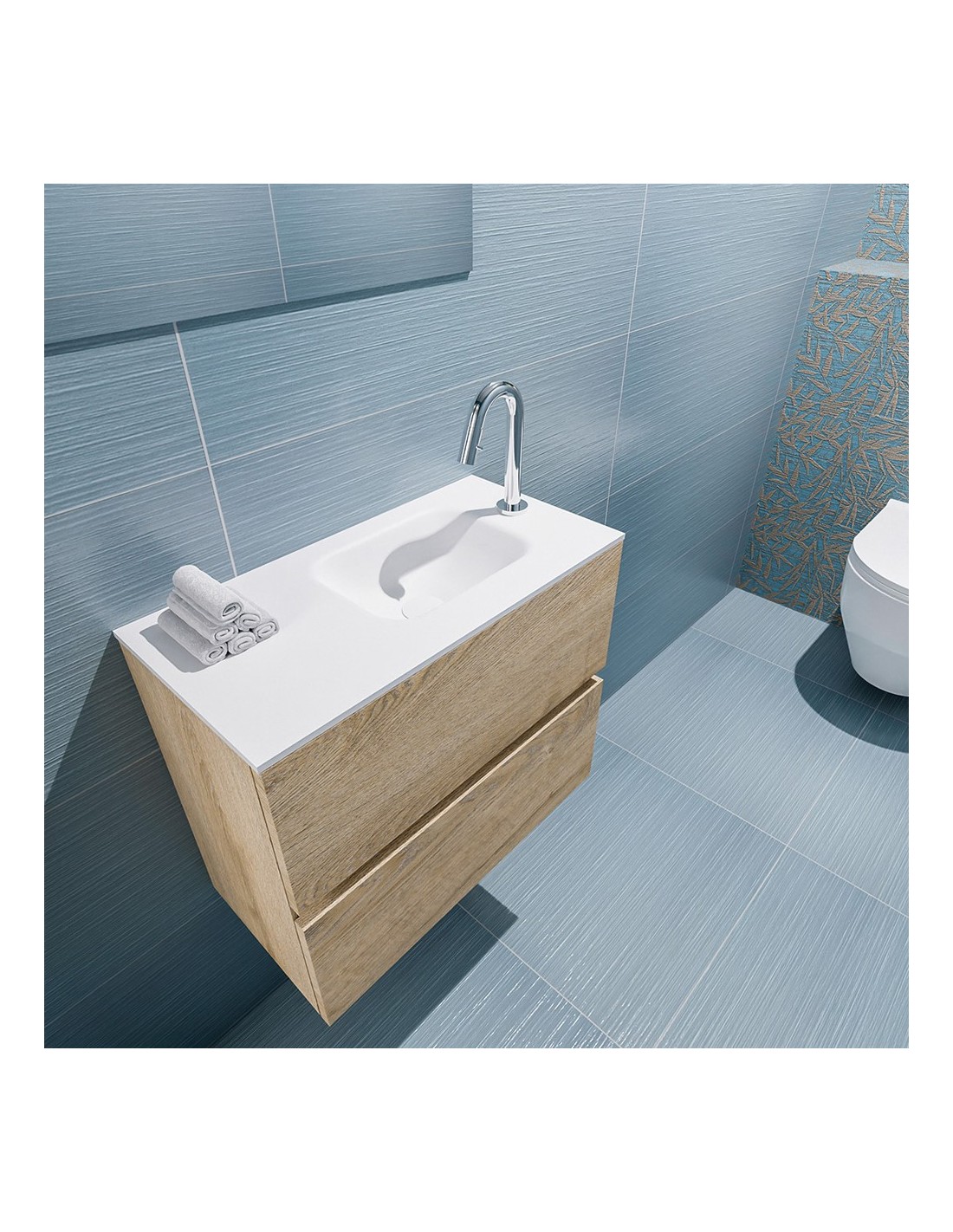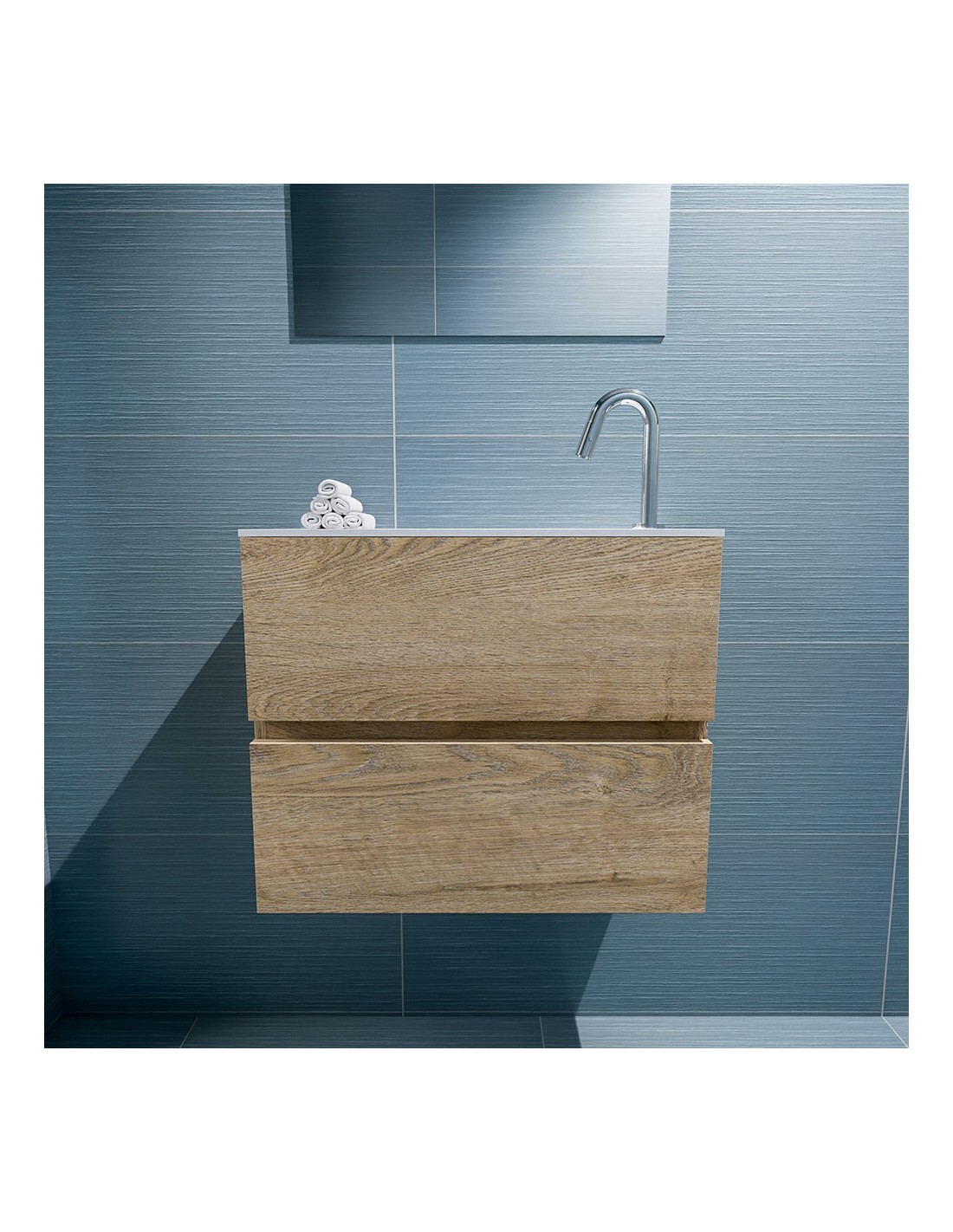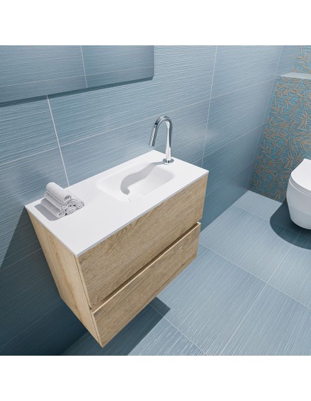 ADA Komplet badmiljø med højrevendt håndvask til bordmonteret armatur. Badmiljøet kommer med 2 skuffer med fuldt udtræk, og er fremstillet i MDF med design af vasket eg. Håndvasken er fremstillet i talkumsfarvet (mat hvid) solid surface. Badmiljøet måler 60 x 50 cm i bredde og højde. Det viste armatur medfølger ikke i sættet.