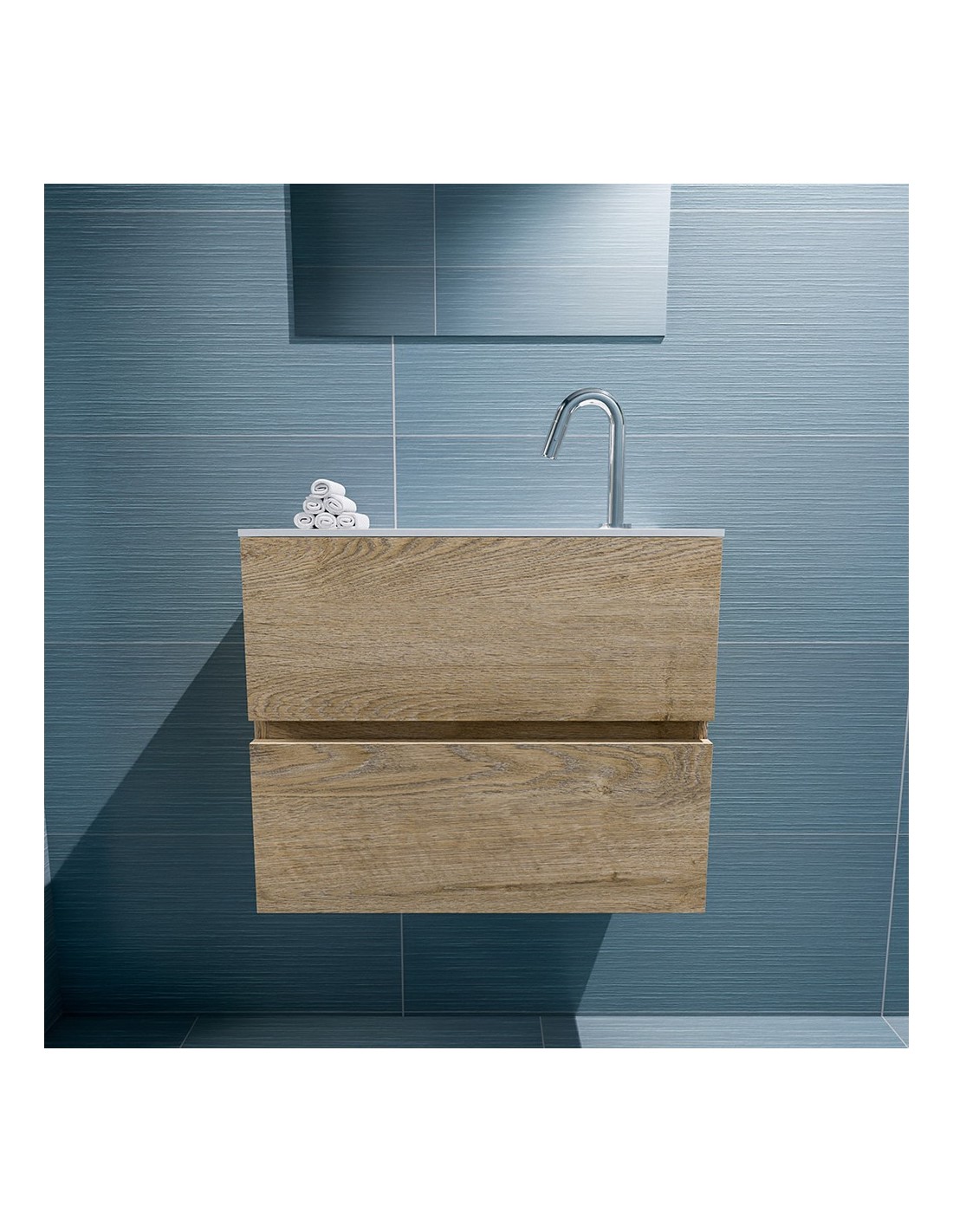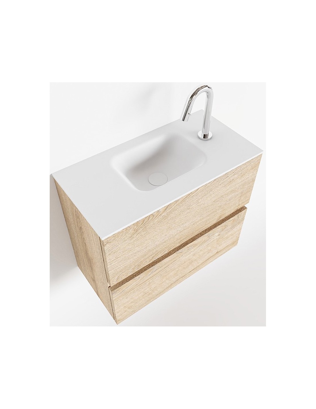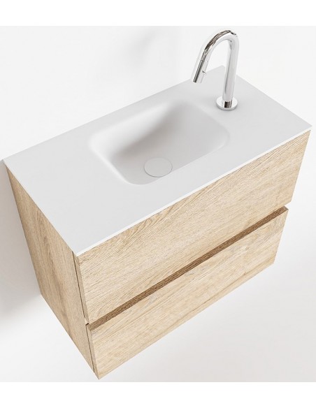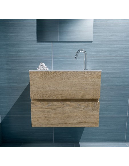 ADA Komplet badmiljø med centreret håndvask til bordmonteret armatur. Badmiljøet kommer med 2 skuffer med fuldt udtræk, og er fremstillet i MDF med design af vasket eg. Håndvasken er fremstillet i talkumsfarvet (mat hvid) solid surface. Badmiljøet måler 60 x 50 cm i bredde og højde. Det viste armatur medfølger ikke i sættet.