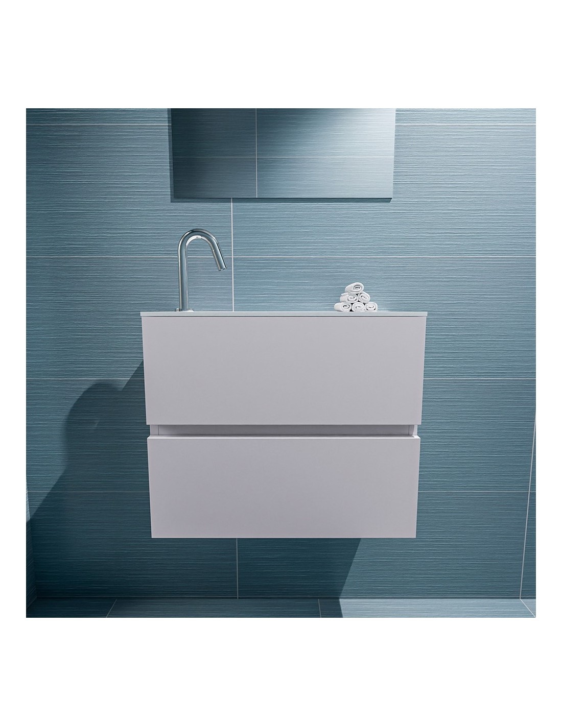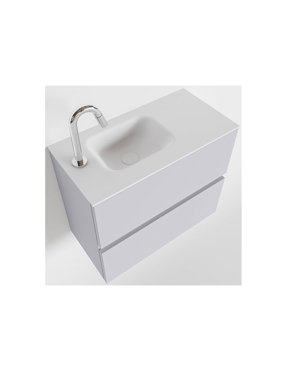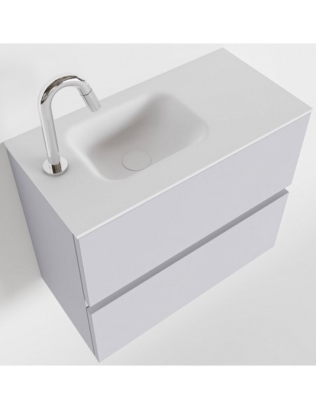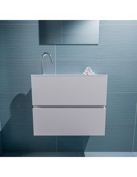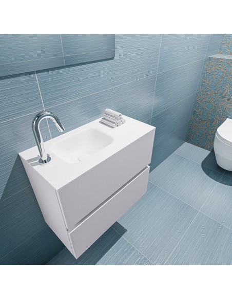 ADA Komplet badmiljø med venstrevendt håndvask til bordmonteret armatur. Badmiljøet kommer med 2 skuffer med fuldt udtræk, og er fremstillet i MDF. Håndvasken er fremstillet i talkumsfarvet (mat hvid) solid surface. Badmiljøet måler 60 x 50 cm i bredde og højde. Det viste armatur medfølger ikke i sættet.