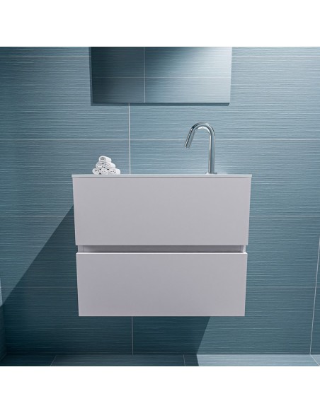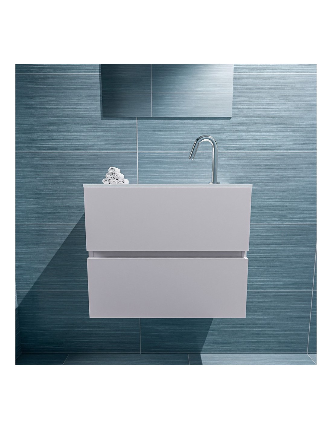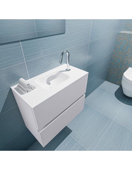 ADA Komplet badmiljø med centreret håndvask til bordmonteret armatur. Badmiljøet kommer med 2 skuffer med fuldt udtræk, og er fremstillet i MDF. Håndvasken er fremstillet i talkumsfarvet (mat hvid) solid surface. Badmiljøet måler 60 x 50 cm i bredde og højde. Det viste armatur medfølger ikke i sættet.