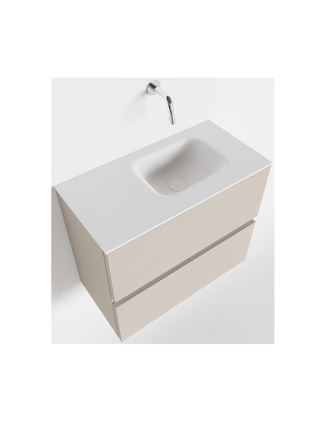 ADA Komplet badmiljø med højrevendt håndvask til vægmonteret armatur. Badmiljøet kommer med 2 skuffer med fuldt udtræk, og er fremstillet i MDF. Håndvasken er fremstillet i talkumsfarvet (mat hvid) solid surface. Badmiljøet måler 60 x 50 cm i bredde og højde. Det viste armatur medfølger ikke i sættet.