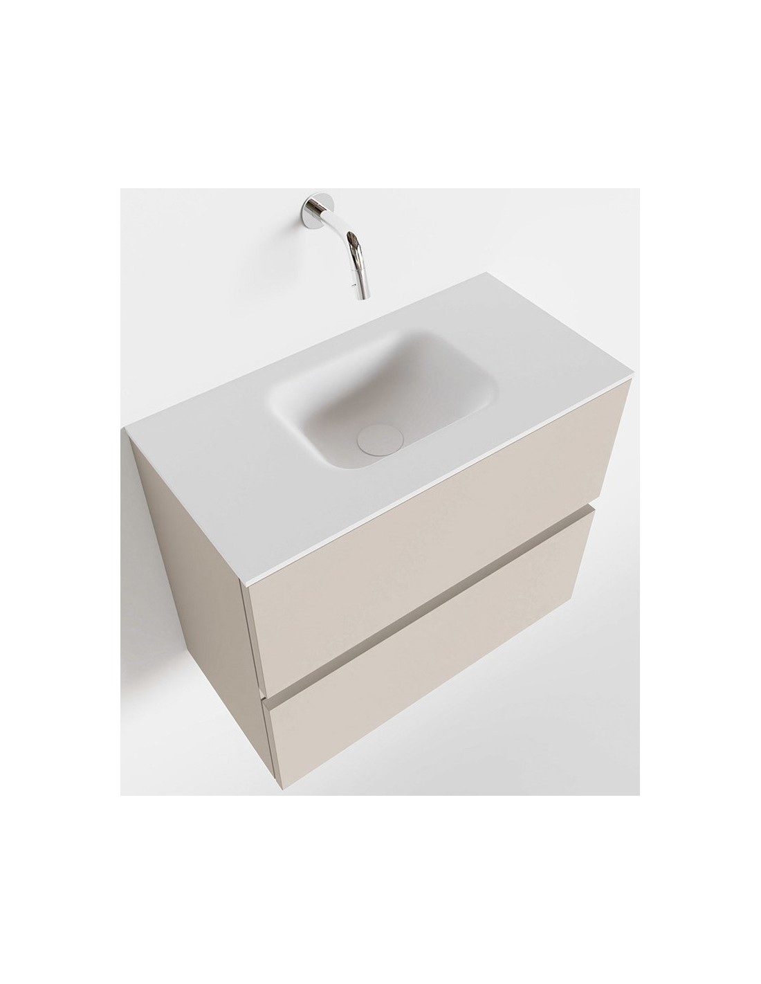 ADA Komplet badmiljø med centreret håndvask til vægmonteret armatur. Badmiljøet kommer med 2 skuffer med fuldt udtræk, og er fremstillet i MDF. Håndvasken er fremstillet i talkumsfarvet (mat hvid) solid surface. Badmiljøet måler 60 x 50 cm i bredde og højde. Det viste armatur medfølger ikke i sættet.