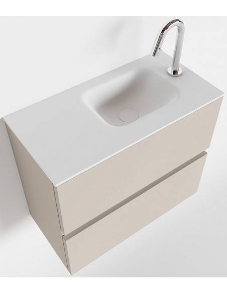 ADA Komplet badmiljø med højrevendt håndvask til bordmonteret armatur. Badmiljøet kommer med 2 skuffer med fuldt udtræk, og er fremstillet i MDF. Håndvasken er fremstillet i talkumsfarvet (mat hvid) solid surface. Badmiljøet måler 60 x 50 cm i bredde og højde. Det viste armatur medfølger ikke i sættet.