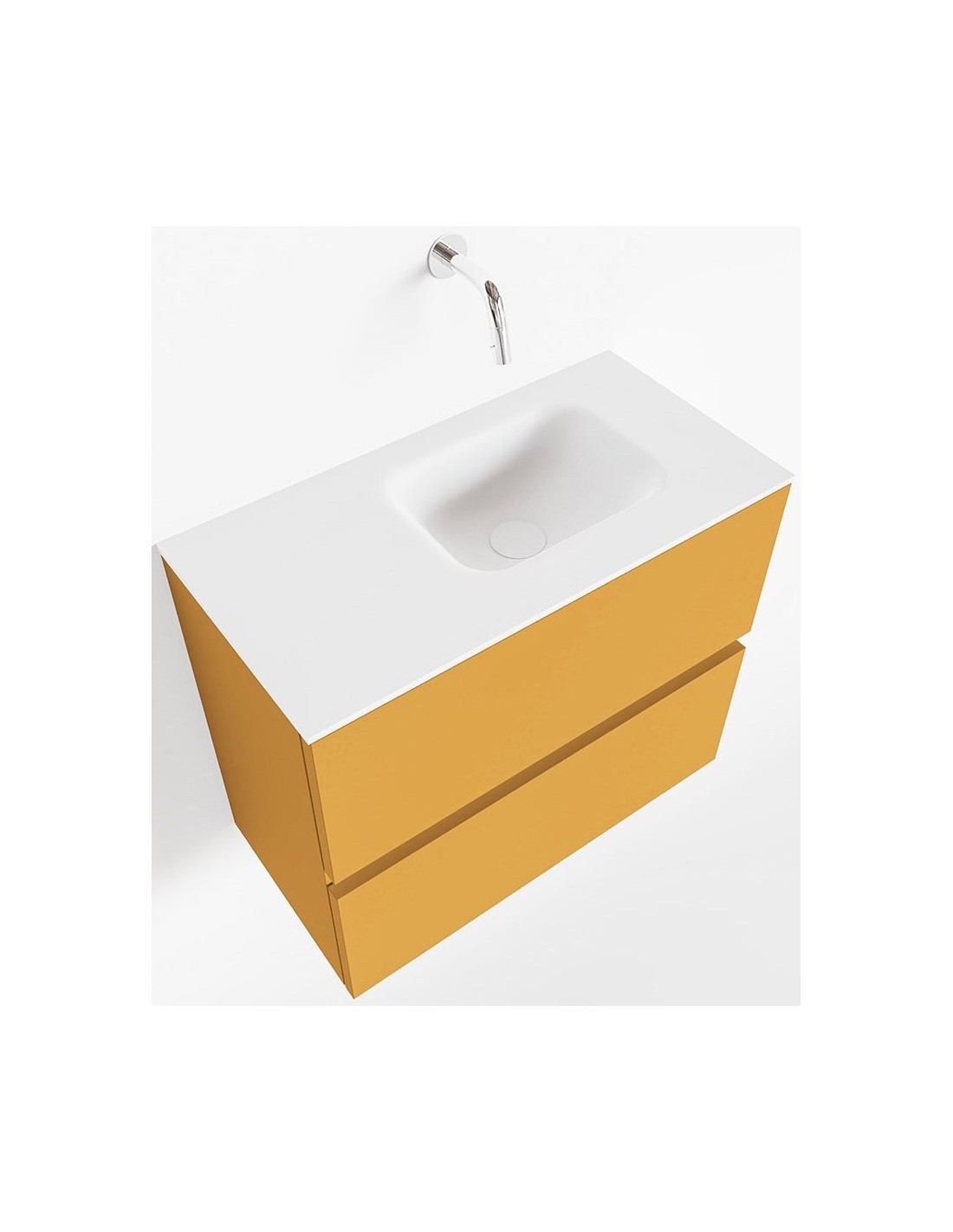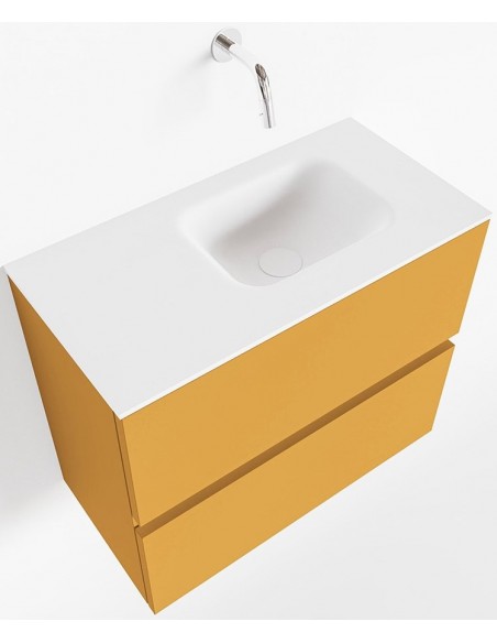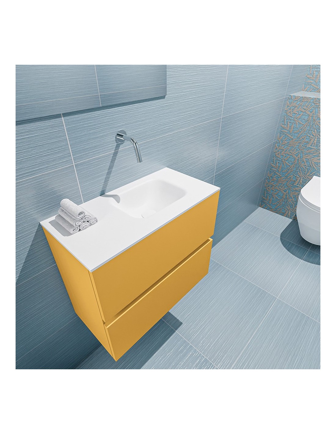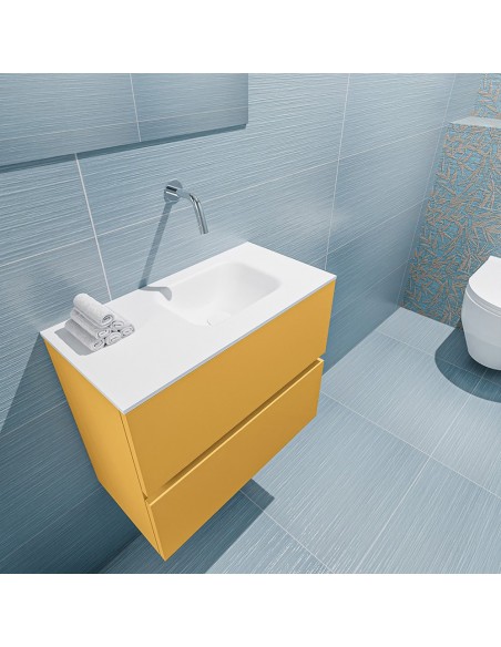 ADA Komplet badmiljø med højrevendt håndvask til vægmonteret armatur. Badmiljøet kommer med 2 skuffer med fuldt udtræk, og er fremstillet i MDF. Håndvasken er fremstillet i talkumsfarvet (mat hvid) solid surface. Badmiljøet måler 60 x 50 cm i bredde og højde. Det viste armatur medfølger ikke i sættet.