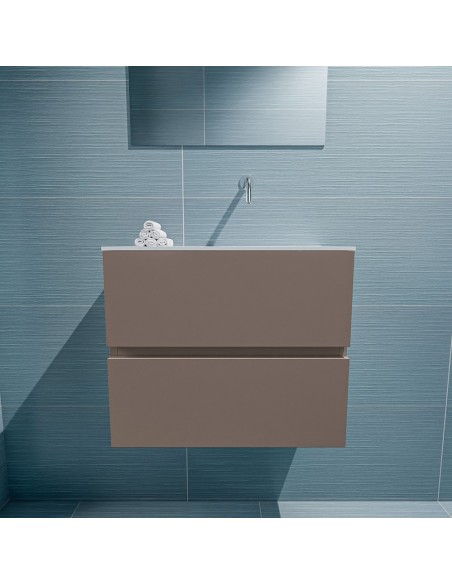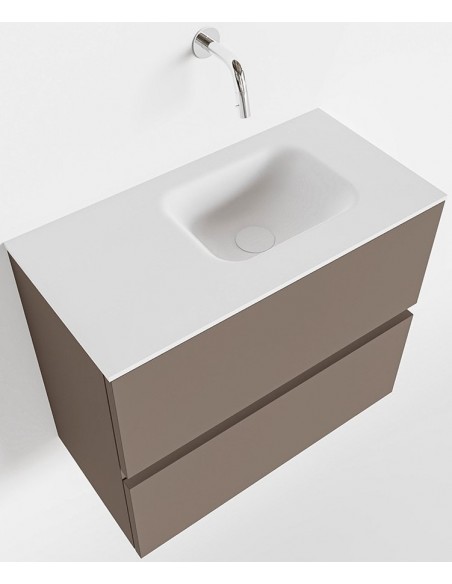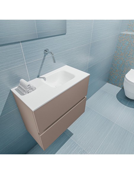 ADA Komplet badmiljø med højrevendt håndvask til vægmonteret armatur. Badmiljøet kommer med 2 skuffer med fuldt udtræk, og er fremstillet i MDF. Håndvasken er fremstillet i talkumsfarvet (mat hvid) solid surface. Badmiljøet måler 60 x 50 cm i bredde og højde. Det viste armatur medfølger ikke i sættet.