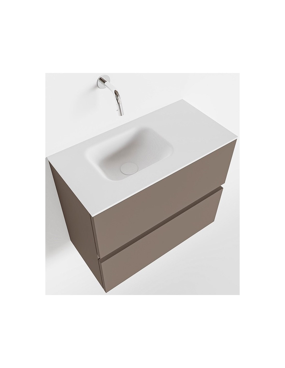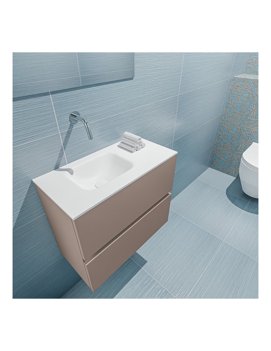 ADA Komplet badmiljø med venstrevendt håndvask til vægmonteret armatur. Badmiljøet kommer med 2 skuffer med fuldt udtræk, og er fremstillet i MDF. Håndvasken er fremstillet i talkumsfarvet (mat hvid) solid surface. Badmiljøet måler 60 x 50 cm i bredde og højde. Det viste armatur medfølger ikke i sættet.
