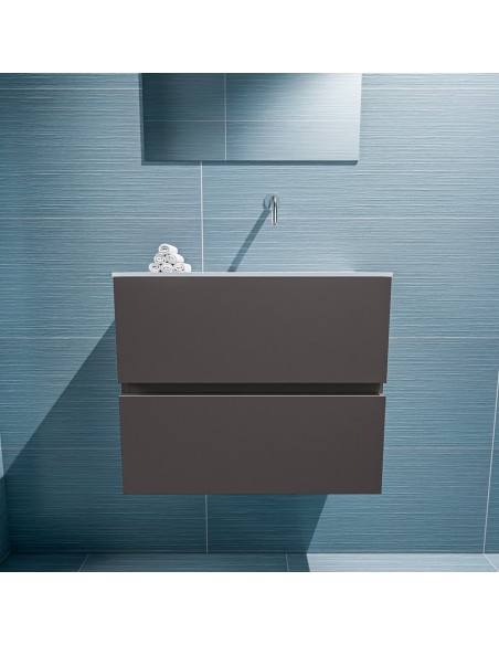 ADA Komplet badmiljø med højrevendt håndvask til vægmonteret armatur. Badmiljøet kommer med 2 skuffer med fuldt udtræk, og er fremstillet i MDF. Håndvasken er fremstillet i talkumsfarvet (mat hvid) solid surface. Badmiljøet måler 60 x 50 cm i bredde og højde. Det viste armatur medfølger ikke i sættet.