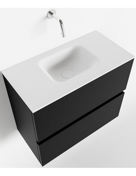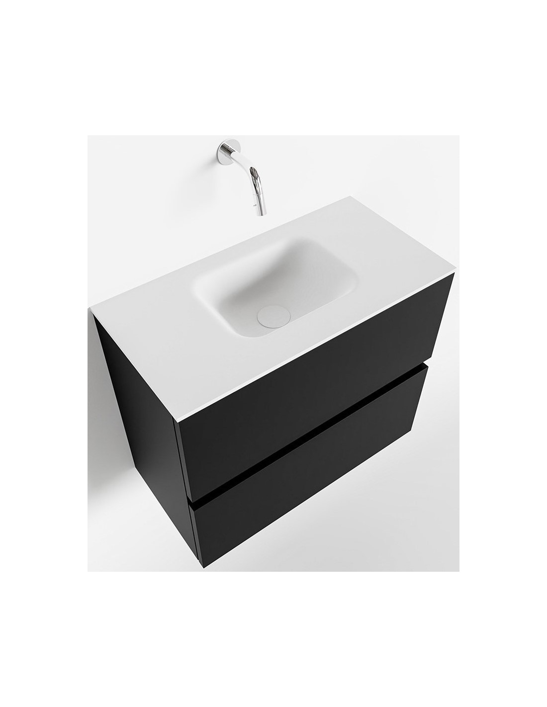 ADA Komplet badmiljø med centreret håndvask til vægmonteret armatur. Badmiljøet kommer med 2 skuffer med fuldt udtræk, og er fremstillet i MDF. Håndvasken er fremstillet i talkumsfarvet (mat hvid) solid surface. Badmiljøet måler 60 x 50 cm i bredde og højde. Det viste armatur medfølger ikke i sættet.