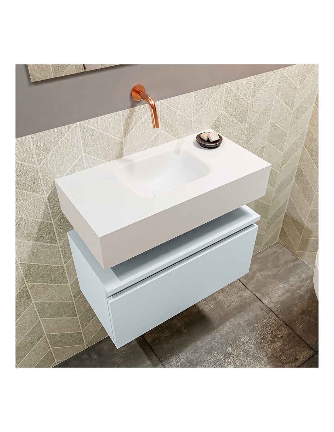 ANDOR Komplet badmiljø med centreret håndvask til vægmonteret armatur. Badmiljøet kommer med 1 skuffe med fuldt udtræk, og er fremstillet i MDF. Håndvasken er fremstillet i talkumsfarvet (mat hvid) solid surface. Badmiljøet måler 60 cm i bredden. Det viste armatur medfølger ikke i sættet.