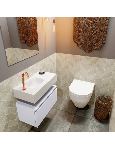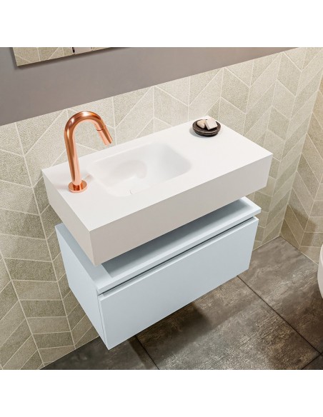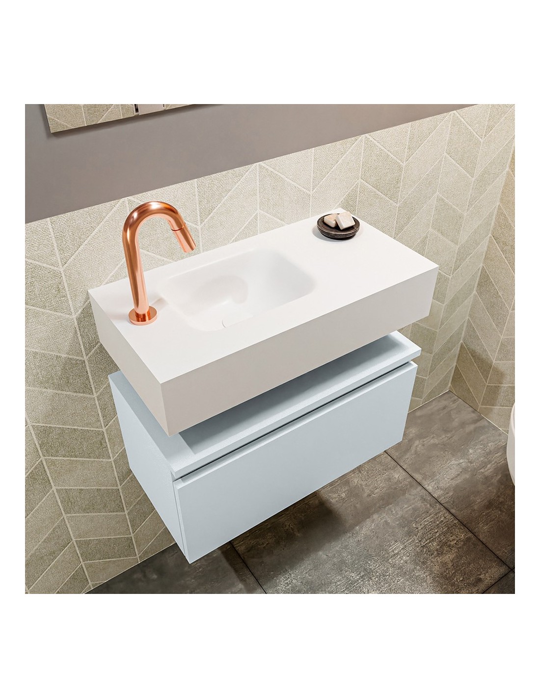 ANDOR Komplet badmiljø med venstrevendt håndvask til bordmonteret armatur. Badmiljøet kommer med 1 skuffe med fuldt udtræk, og er fremstillet i MDF. Håndvasken er fremstillet i talkumsfarvet (mat hvid) solid surface. Badmiljøet måler 60 cm i bredden. Det viste armatur medfølger ikke i sættet.