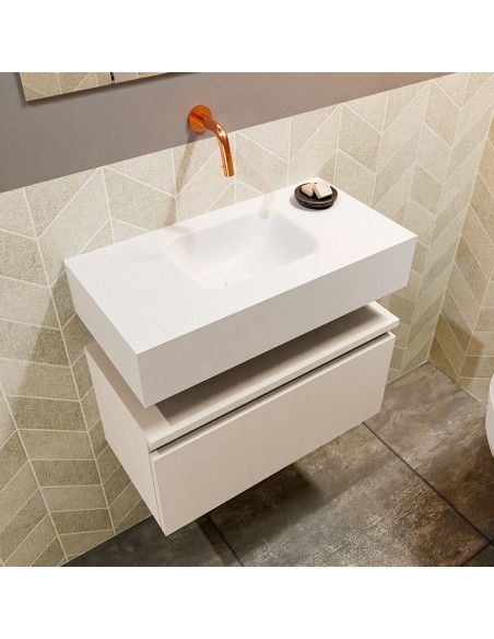 ANDOR Komplet badmiljø med centreret håndvask til vægmonteret armatur. Badmiljøet kommer med 1 skuffe med fuldt udtræk, og er fremstillet i MDF. Håndvasken er fremstillet i talkumsfarvet (mat hvid) solid surface. Badmiljøet måler 60 cm i bredden. Det viste armatur medfølger ikke i sættet.