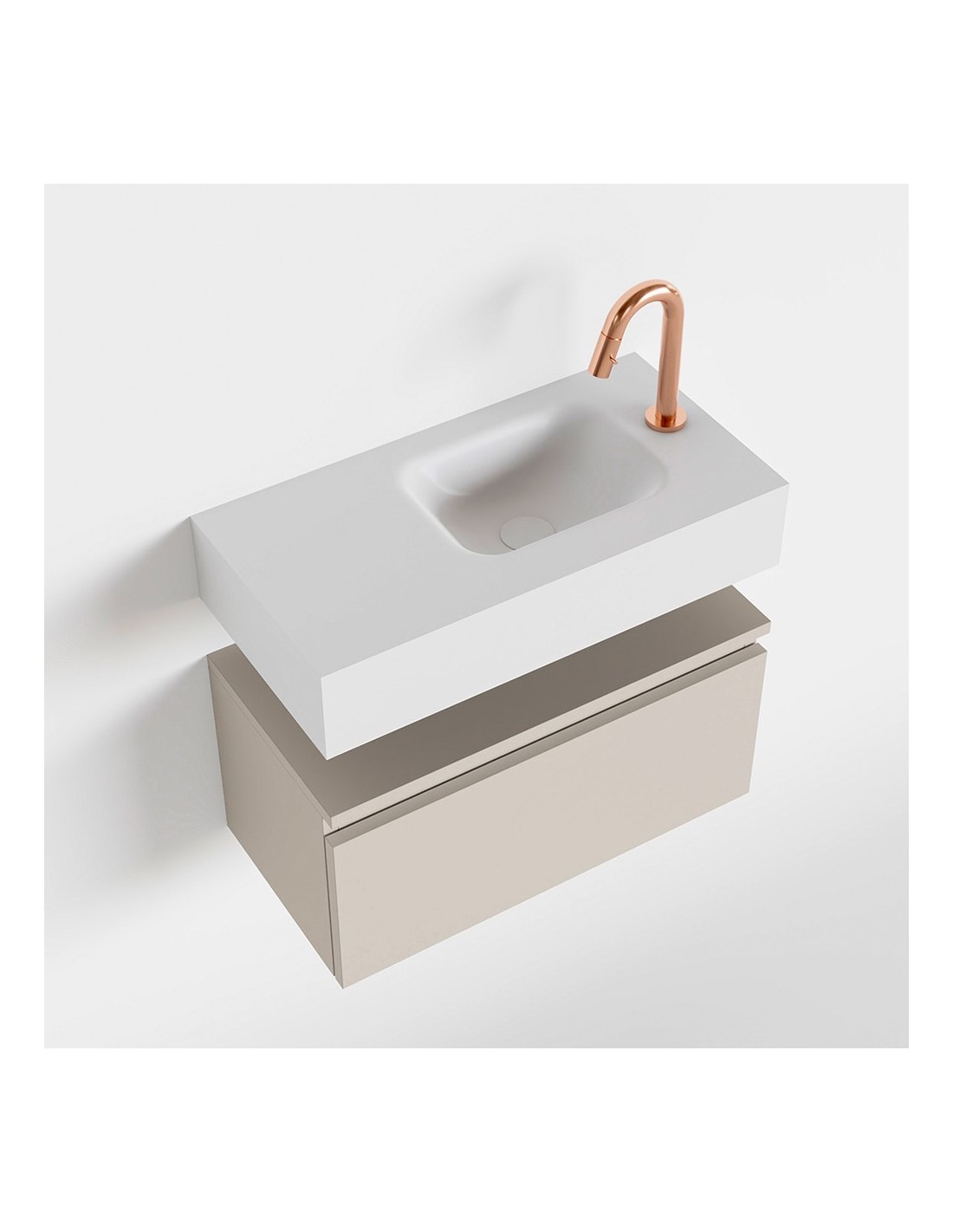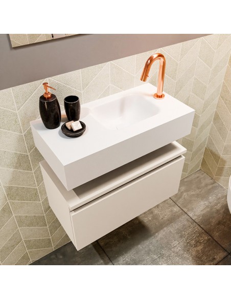 ANDOR Komplet badmiljø med højrevendt håndvask til bordmonteret armatur. Badmiljøet kommer med 1 skuffe med fuldt udtræk, og er fremstillet i MDF. Håndvasken er fremstillet i talkumsfarvet (mat hvid) solid surface. Badmiljøet måler 60 cm i bredden. Det viste armatur medfølger ikke i sættet.