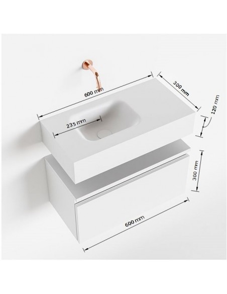 ANDOR Komplet badmiljø med venstrevendt håndvask til bordmonteret armatur. Badmiljøet kommer med 1 skuffe med fuldt udtræk, og er fremstillet i MDF. Håndvasken er fremstillet i talkumsfarvet (mat hvid) solid surface. Badmiljøet måler 60 cm i bredden. Det viste armatur medfølger ikke i sættet.