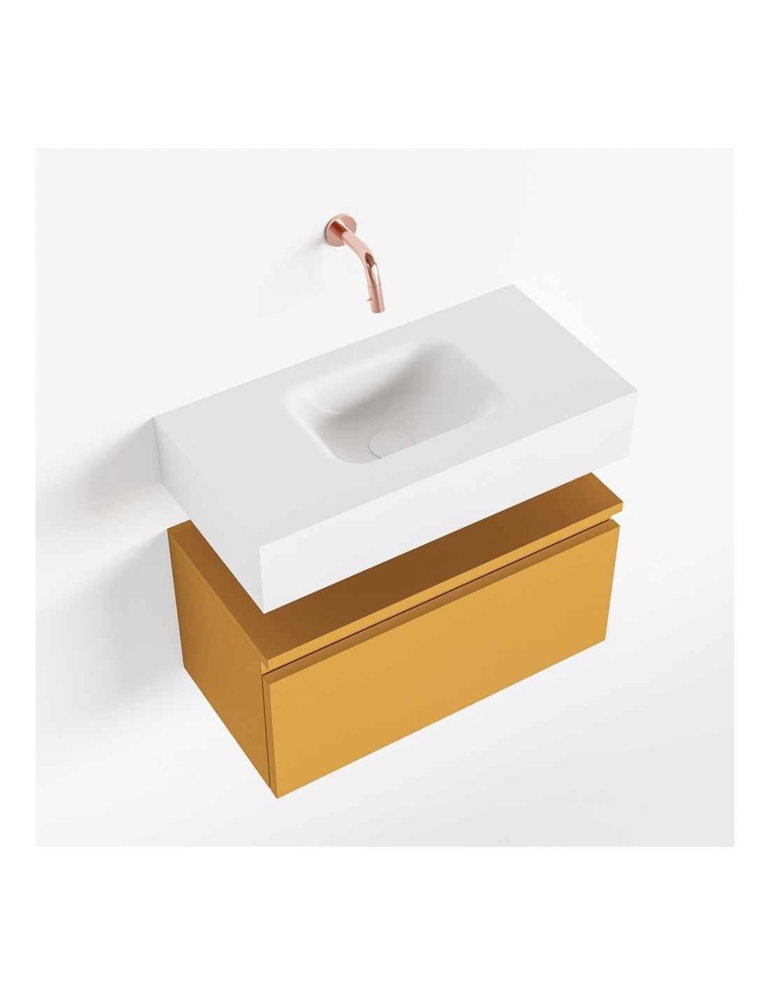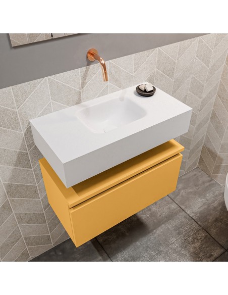 ANDOR Komplet badmiljø med centreret håndvask til vægmonteret armatur. Badmiljøet kommer med 1 skuffe med fuldt udtræk, og er fremstillet i MDF. Håndvasken er fremstillet i talkumsfarvet (mat hvid) solid surface. Badmiljøet måler 60 cm i bredden. Det viste armatur medfølger ikke i sættet.