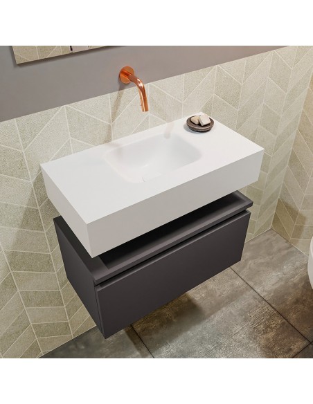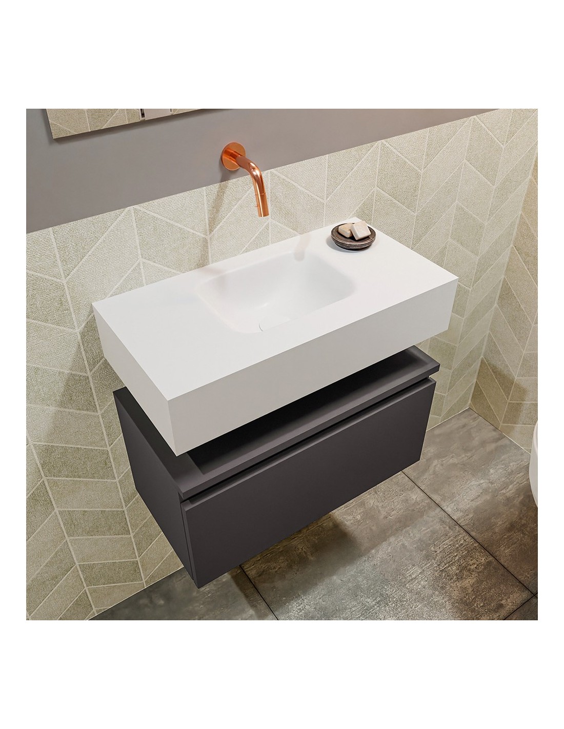 ANDOR Komplet badmiljø med centreret håndvask til vægmonteret armatur. Badmiljøet kommer med 1 skuffe med fuldt udtræk, og er fremstillet i MDF. Håndvasken er fremstillet i talkumsfarvet (mat hvid) solid surface. Badmiljøet måler 60 cm i bredden. Det viste armatur medfølger ikke i sættet.