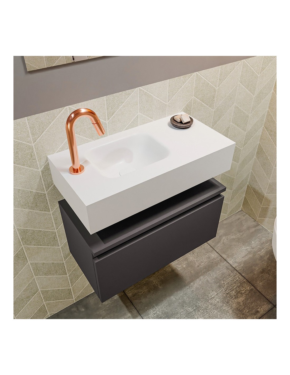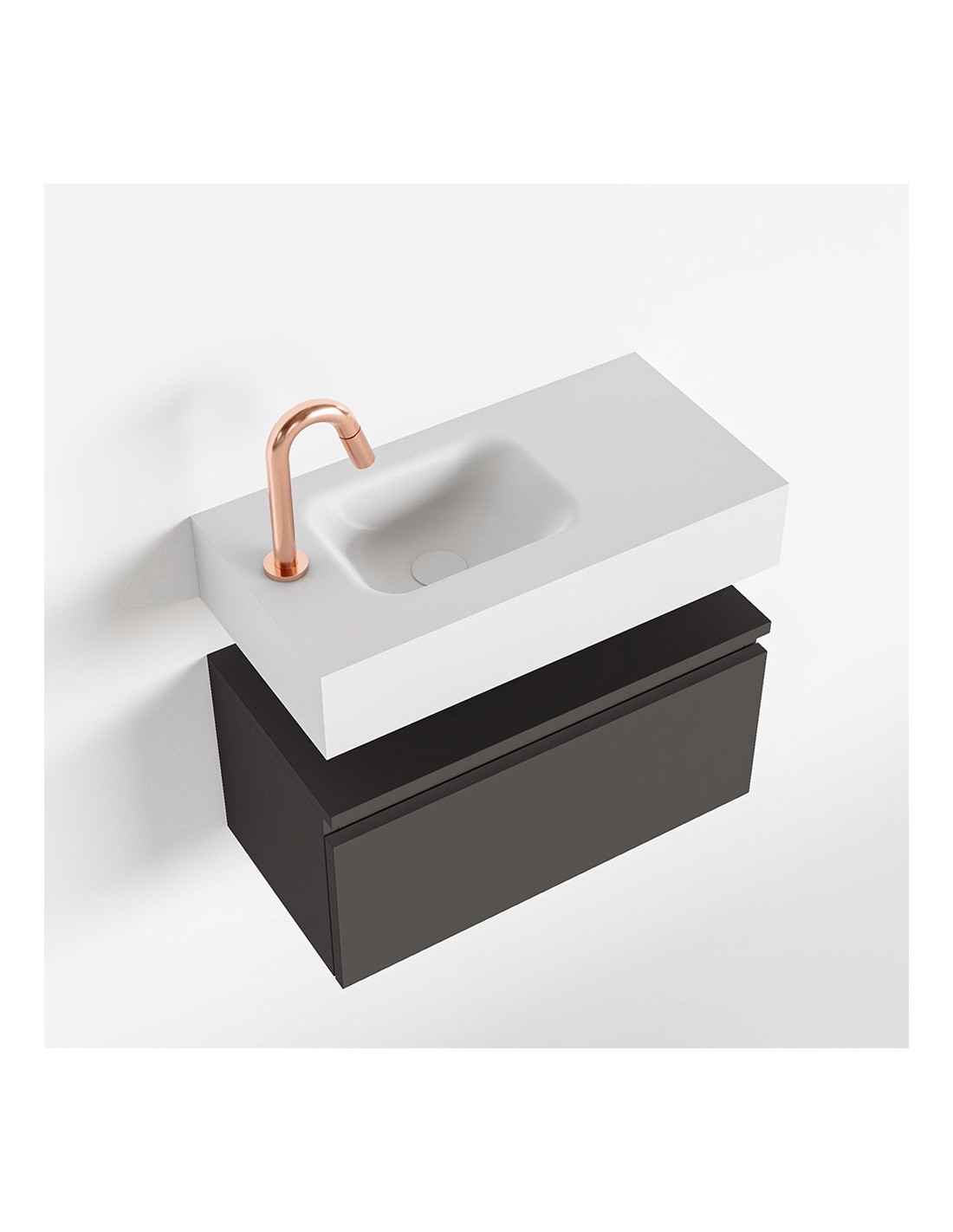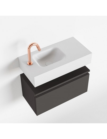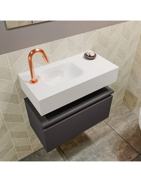 ANDOR Komplet badmiljø med venstrevendt håndvask til bordmonteret armatur. Badmiljøet kommer med 1 skuffe med fuldt udtræk, og er fremstillet i MDF. Håndvasken er fremstillet i talkumsfarvet (mat hvid) solid surface. Badmiljøet måler 60 cm i bredden. Det viste armatur medfølger ikke i sættet.