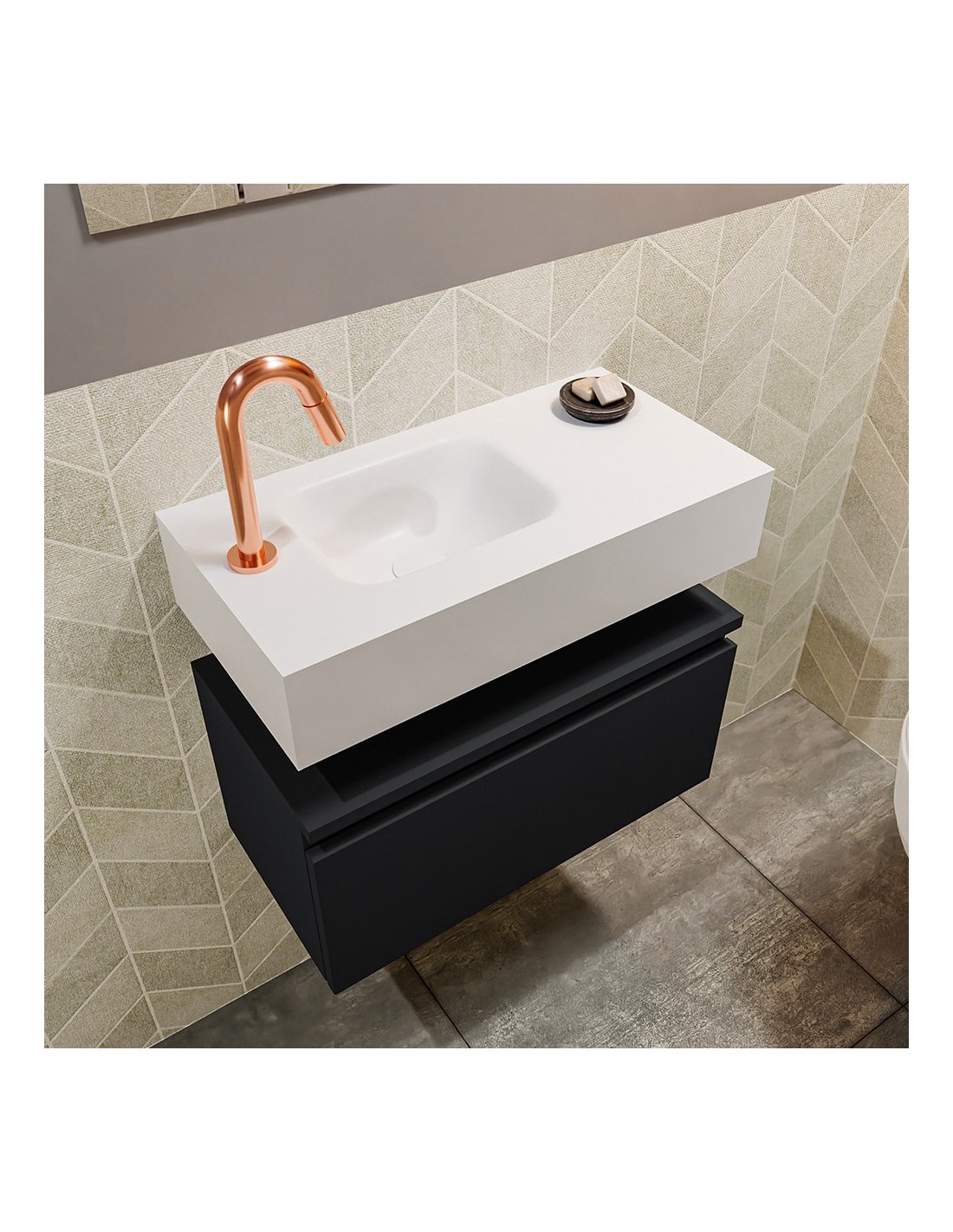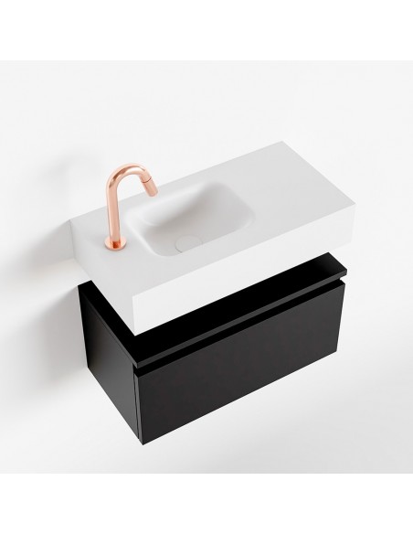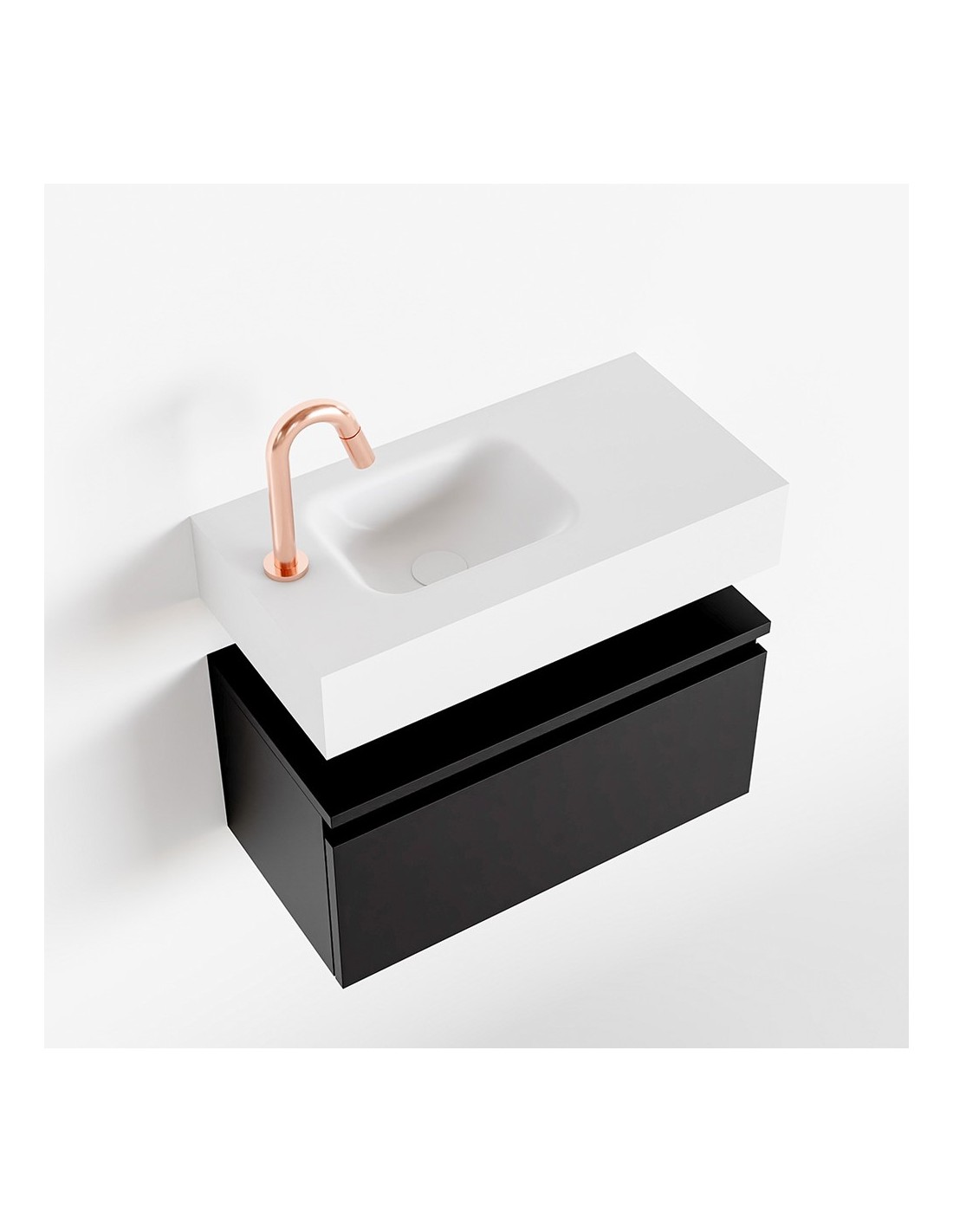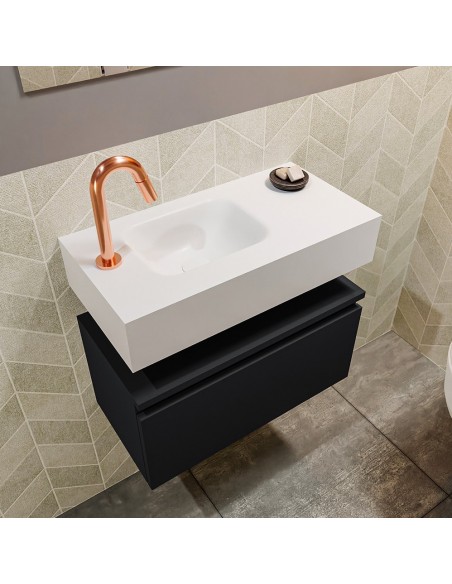 ANDOR Komplet badmiljø med venstrevendt håndvask til bordmonteret armatur. Badmiljøet kommer med 1 skuffe med fuldt udtræk, og er fremstillet i MDF. Håndvasken er fremstillet i talkumsfarvet (mat hvid) solid surface. Badmiljøet måler 60 cm i bredden. Det viste armatur medfølger ikke i sættet.