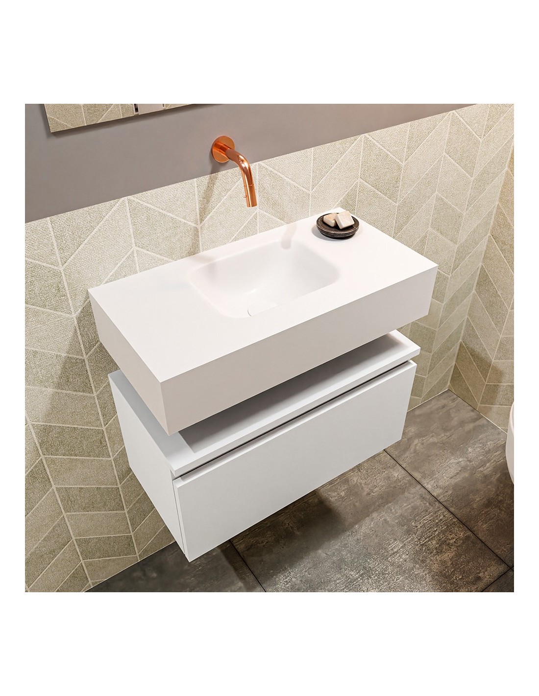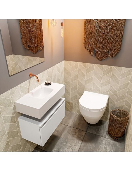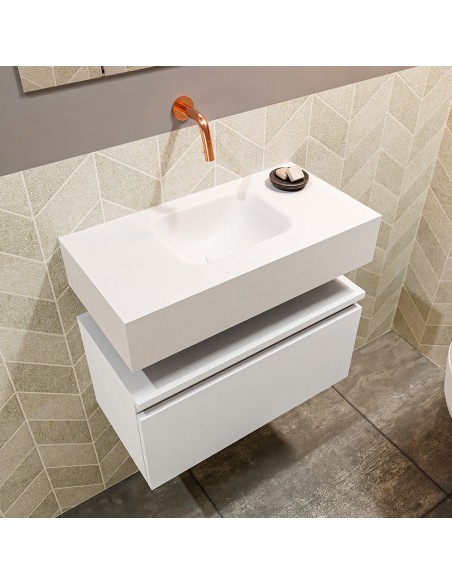 ANDOR Komplet badmiljø med centreret håndvask til vægmonteret armatur. Badmiljøet kommer med 1 skuffe med fuldt udtræk, og er fremstillet i MDF. Håndvasken er fremstillet i talkumsfarvet (mat hvid) solid surface. Badmiljøet måler 60 cm i bredden. Det viste armatur medfølger ikke i sættet.