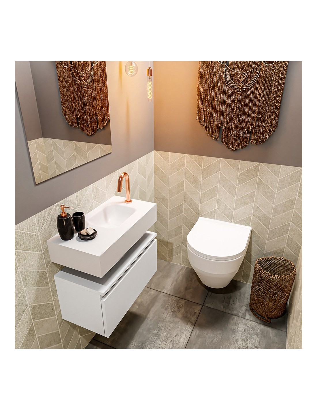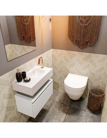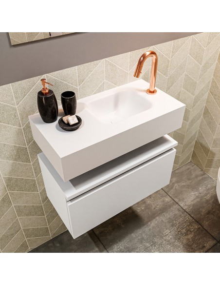 ANDOR Komplet badmiljø med højrevendt håndvask til bordmonteret armatur. Badmiljøet kommer med 1 skuffe med fuldt udtræk, og er fremstillet i MDF. Håndvasken er fremstillet i talkumsfarvet (mat hvid) solid surface. Badmiljøet måler 60 cm i bredden. Det viste armatur medfølger ikke i sættet.