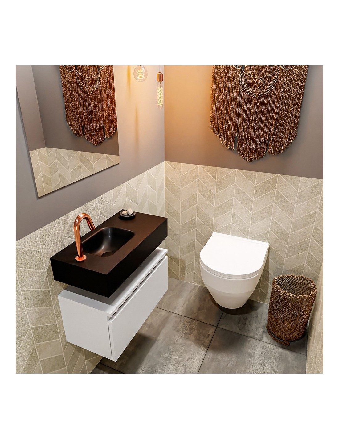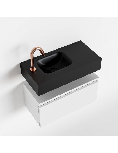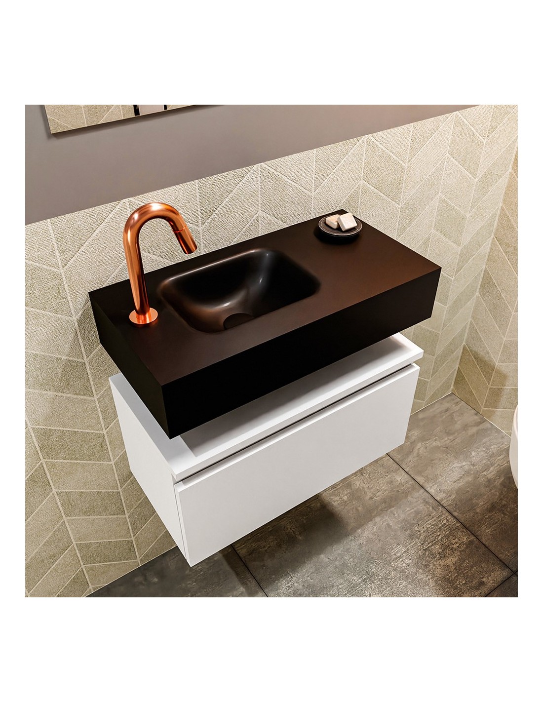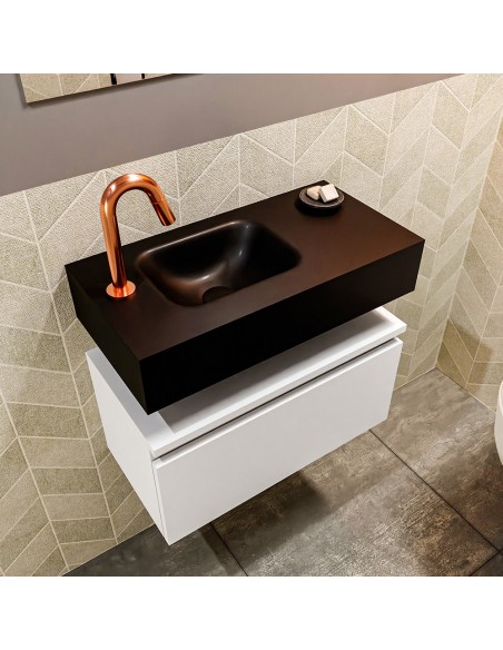 ANDOR Komplet badmiljø med venstrevendt håndvask til bordmonteret armatur. Badmiljøet kommer med 1 skuffe med fuldt udtræk, og er fremstillet i MDF. Håndvasken er fremstillet i sort solid surface. Badmiljøet måler 60 cm i bredden. Det viste armatur medfølger ikke i sættet.