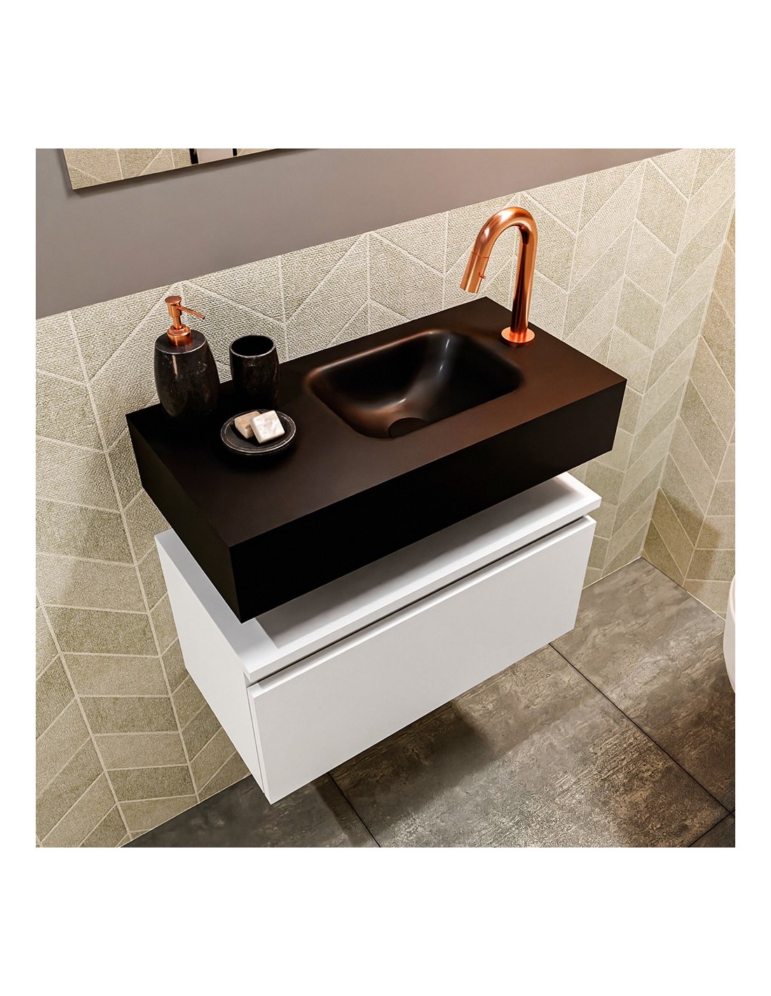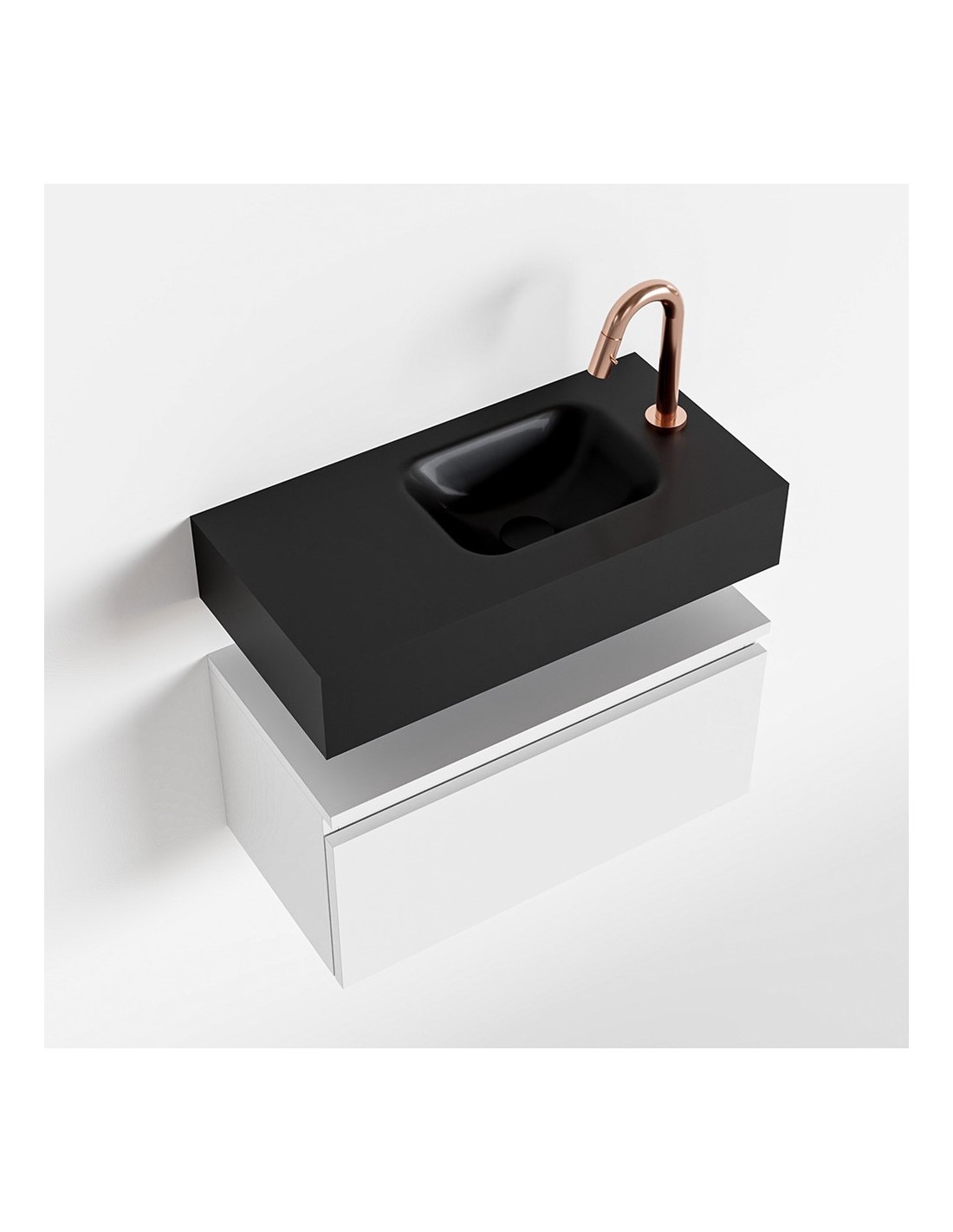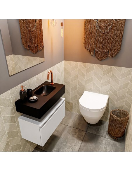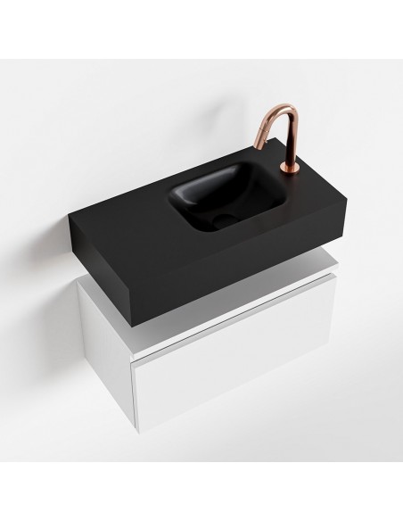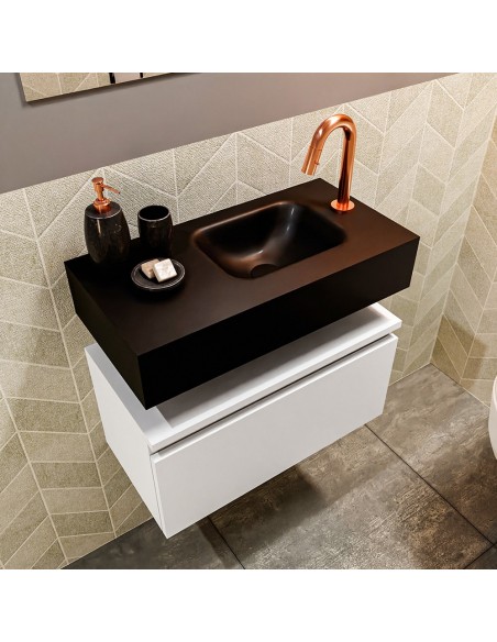 ANDOR Komplet badmiljø med højrevendt håndvask til bordmonteret armatur. Badmiljøet kommer med 1 skuffe med fuldt udtræk, og er fremstillet i MDF. Håndvasken er fremstillet i sort solid surface. Badmiljøet måler 60 cm i bredden. Det viste armatur medfølger ikke i sættet.