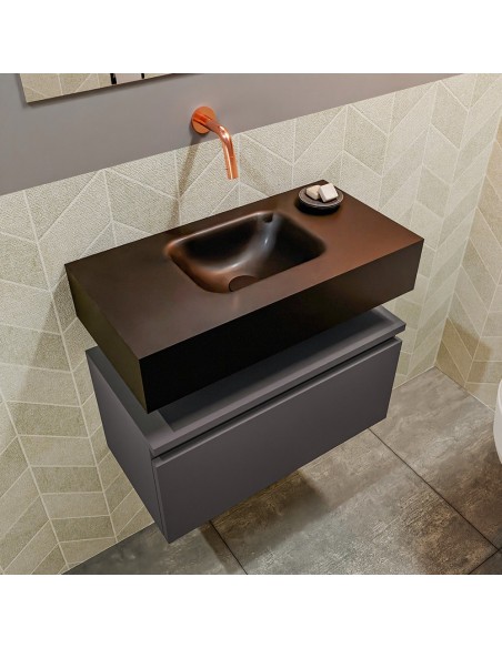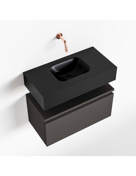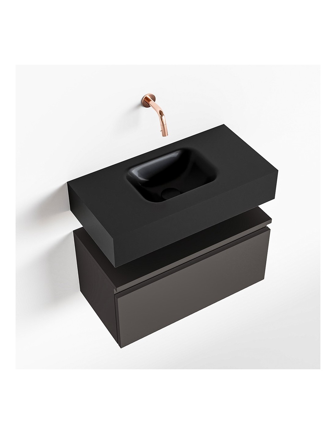ANDOR Komplet badmiljø med centreret håndvask til vægmonteret armatur. Badmiljøet kommer med 1 skuffe med fuldt udtræk, og er fremstillet i MDF. Håndvasken er fremstillet i sort solid surface. Badmiljøet måler 60 cm i bredden. Det viste armatur medfølger ikke i sættet.
