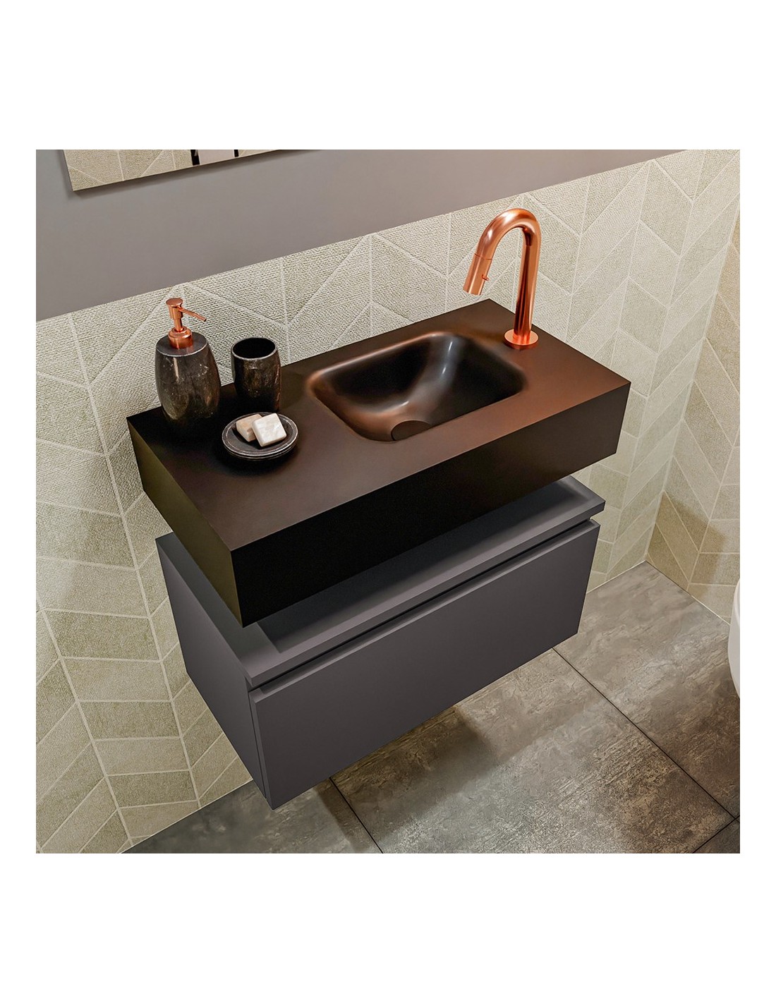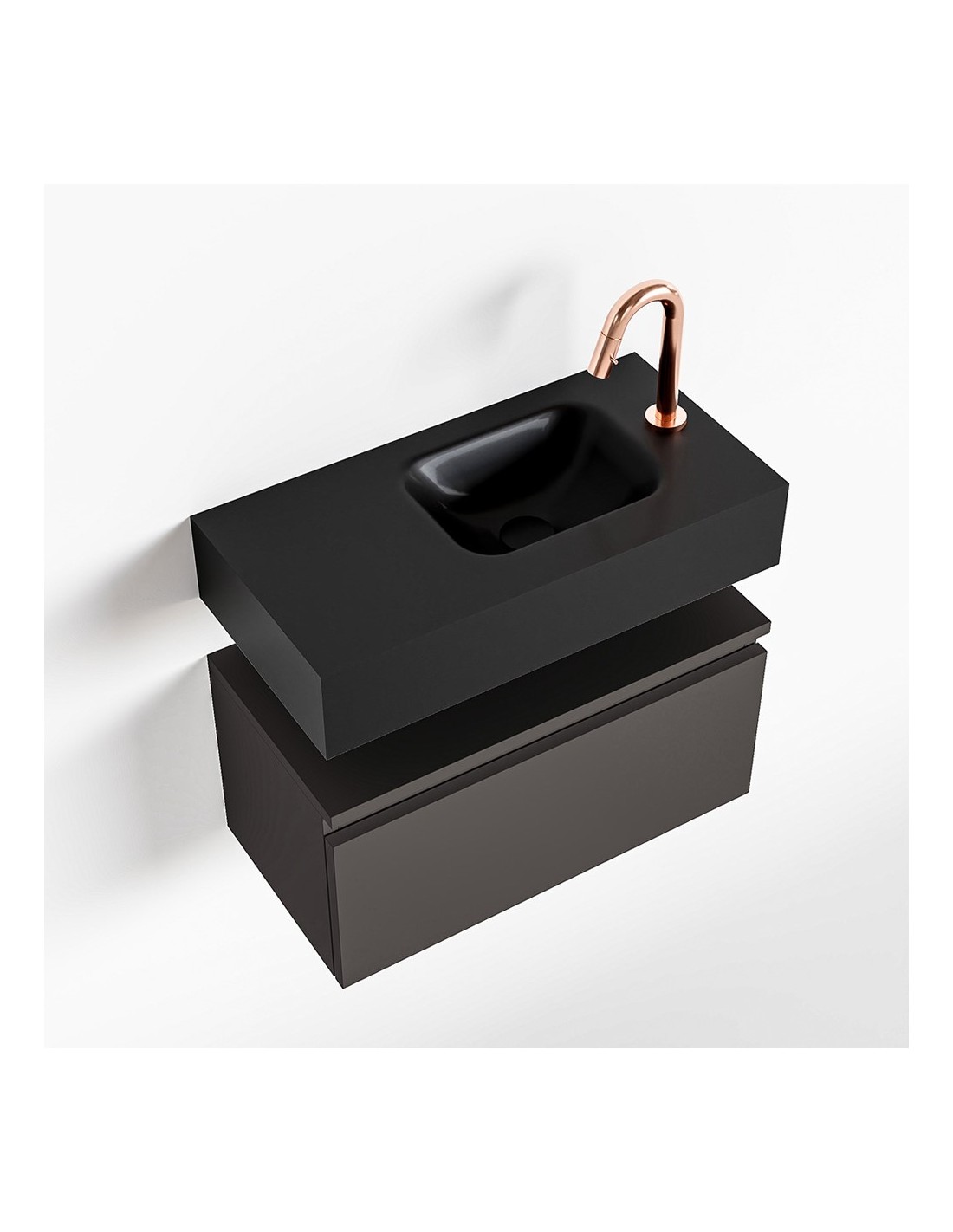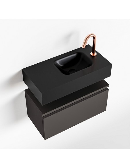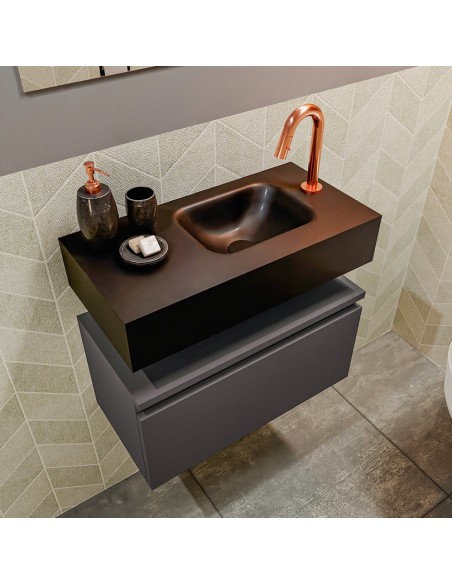 ANDOR Komplet badmiljø med højrevendt håndvask til bordmonteret armatur. Badmiljøet kommer med 1 skuffe med fuldt udtræk, og er fremstillet i MDF. Håndvasken er fremstillet i sort solid surface. Badmiljøet måler 60 cm i bredden. Det viste armatur medfølger ikke i sættet.