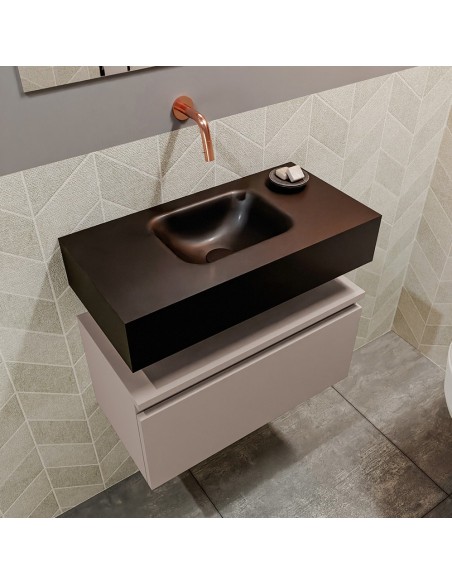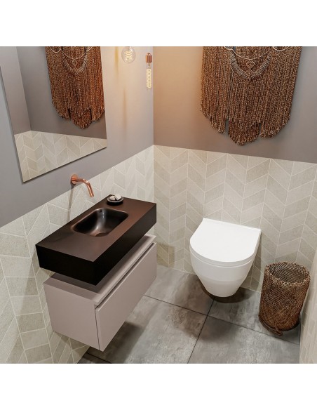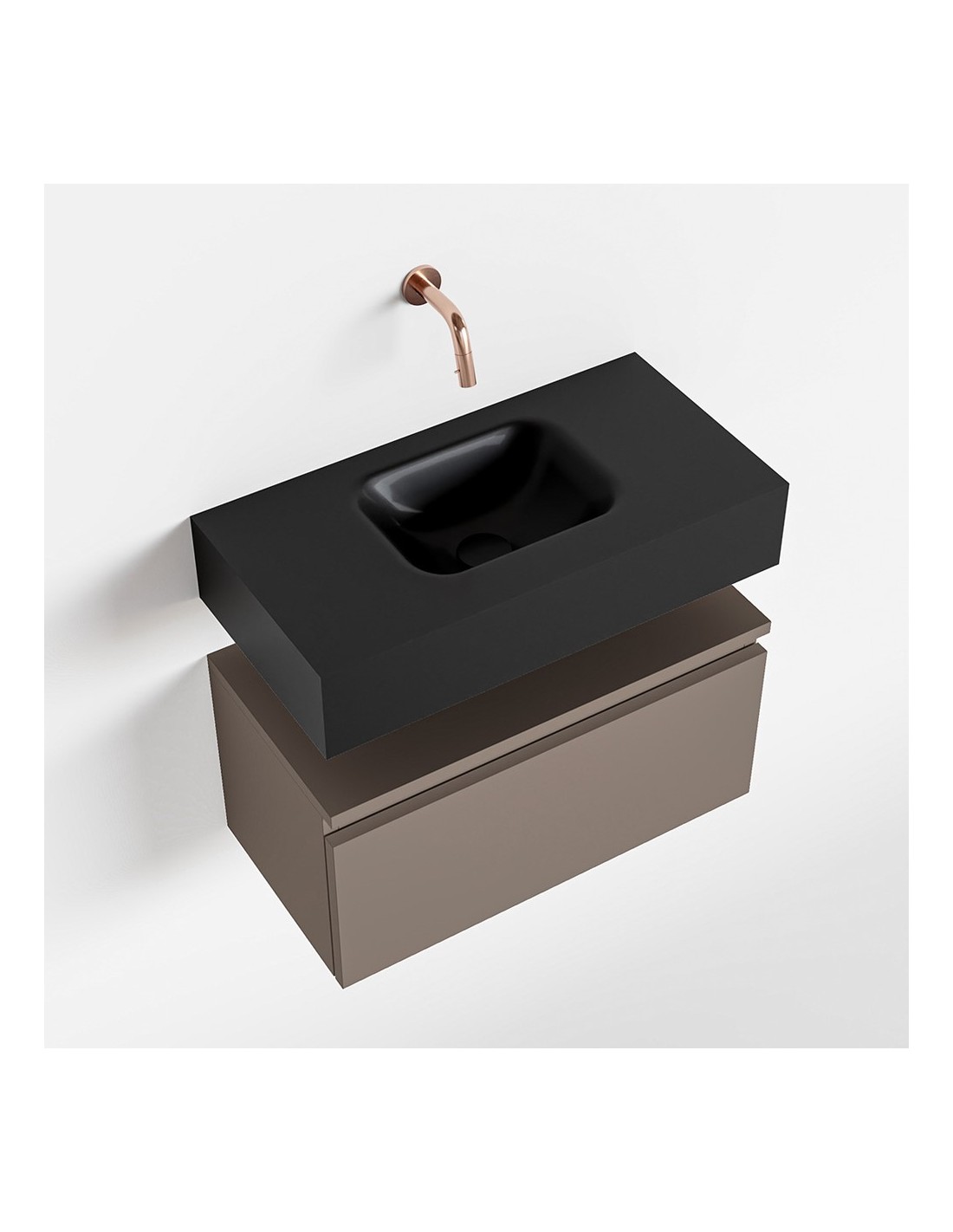 ANDOR Komplet badmiljø med centreret håndvask til vægmonteret armatur. Badmiljøet kommer med 1 skuffe med fuldt udtræk, og er fremstillet i MDF. Håndvasken er fremstillet i sort solid surface. Badmiljøet måler 60 cm i bredden. Det viste armatur medfølger ikke i sættet.