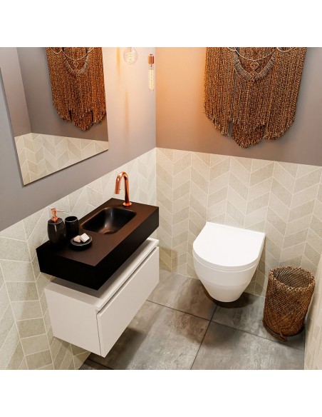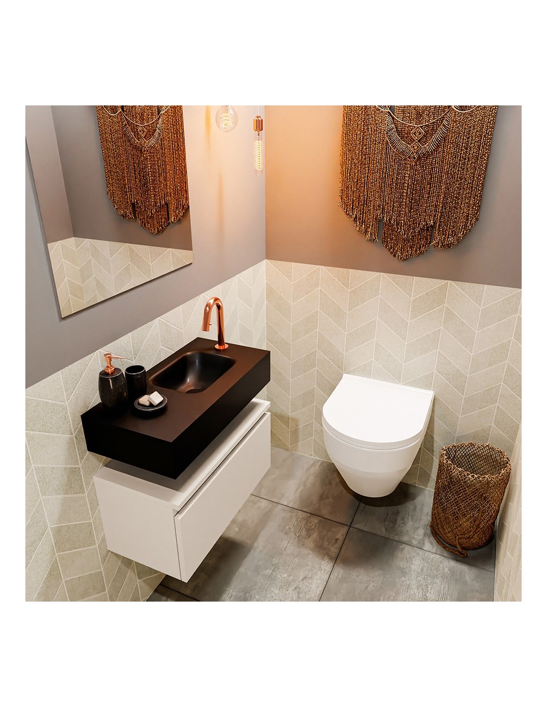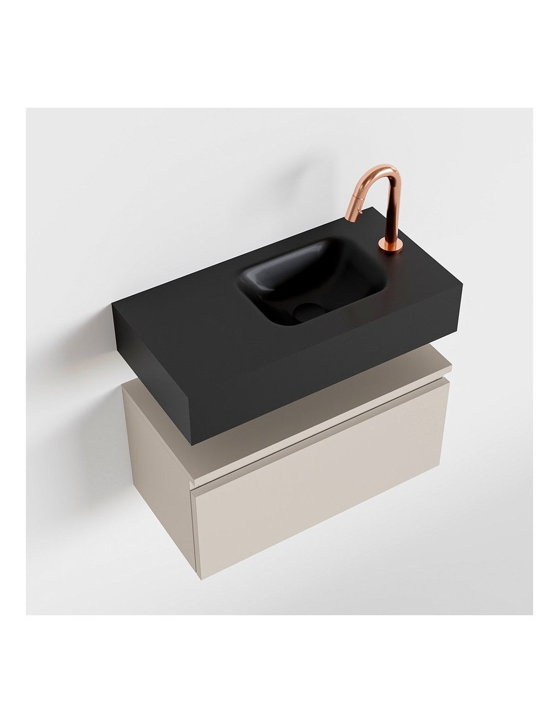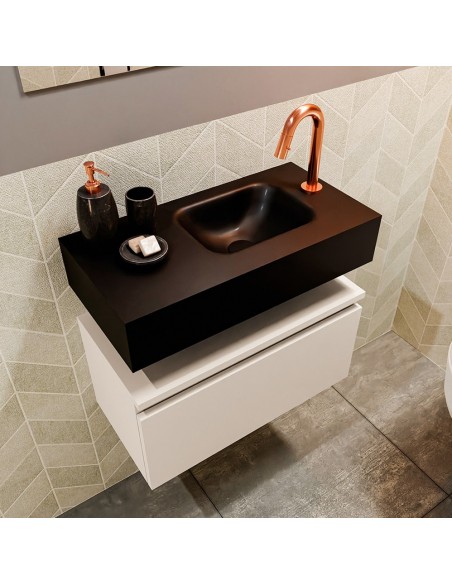 ANDOR Komplet badmiljø med højrevendt håndvask til bordmonteret armatur. Badmiljøet kommer med 1 skuffe med fuldt udtræk, og er fremstillet i MDF. Håndvasken er fremstillet i sort solid surface. Badmiljøet måler 60 cm i bredden. Det viste armatur medfølger ikke i sættet.