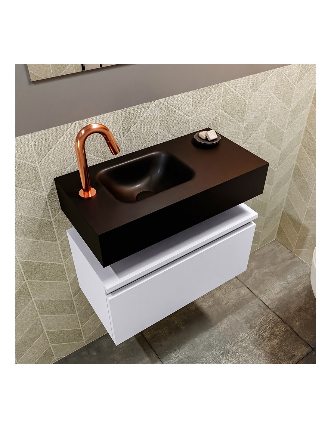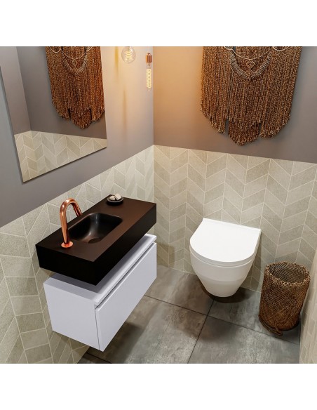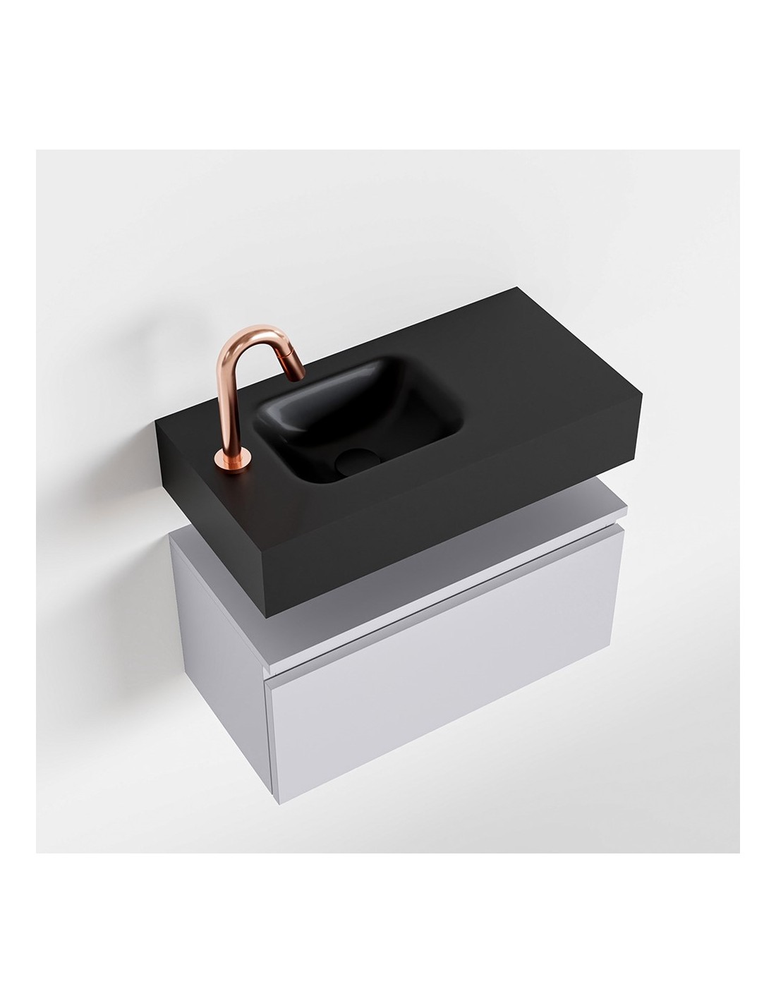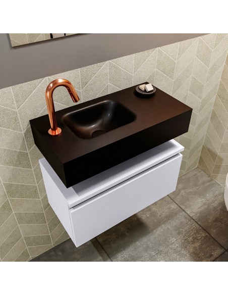 ANDOR Komplet badmiljø med venstrevendt håndvask til bordmonteret armatur. Badmiljøet kommer med 1 skuffe med fuldt udtræk, og er fremstillet i MDF. Håndvasken er fremstillet i sort solid surface. Badmiljøet måler 60 cm i bredden. Det viste armatur medfølger ikke i sættet.