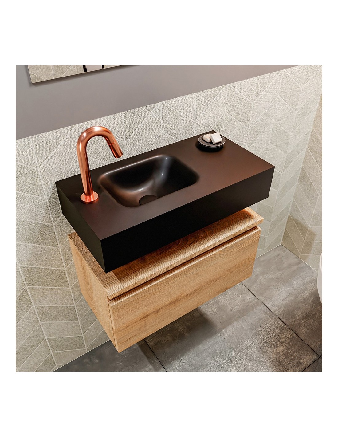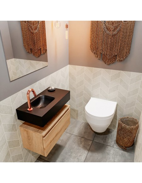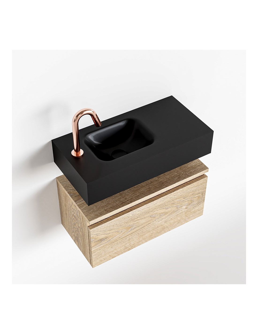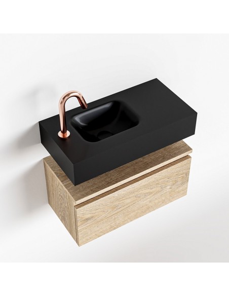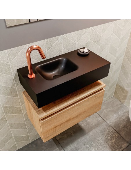 ANDOR Komplet badmiljø med venstrevendt håndvask til bordmonteret armatur. Badmiljøet kommer med 1 skuffe med fuldt udtræk, og er fremstillet i MDF med design af vasket eg. Håndvasken er fremstillet i sort solid surface. Badmiljøet måler 60 cm i bredden. Det viste armatur medfølger ikke i sættet.
