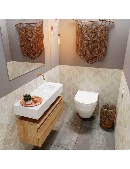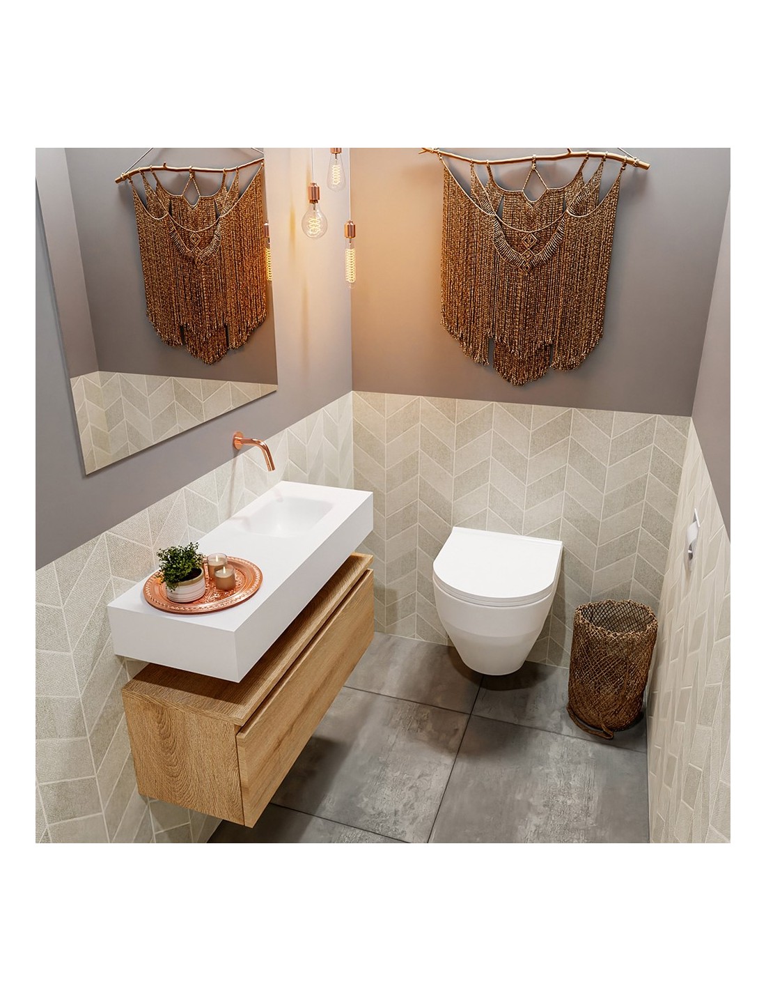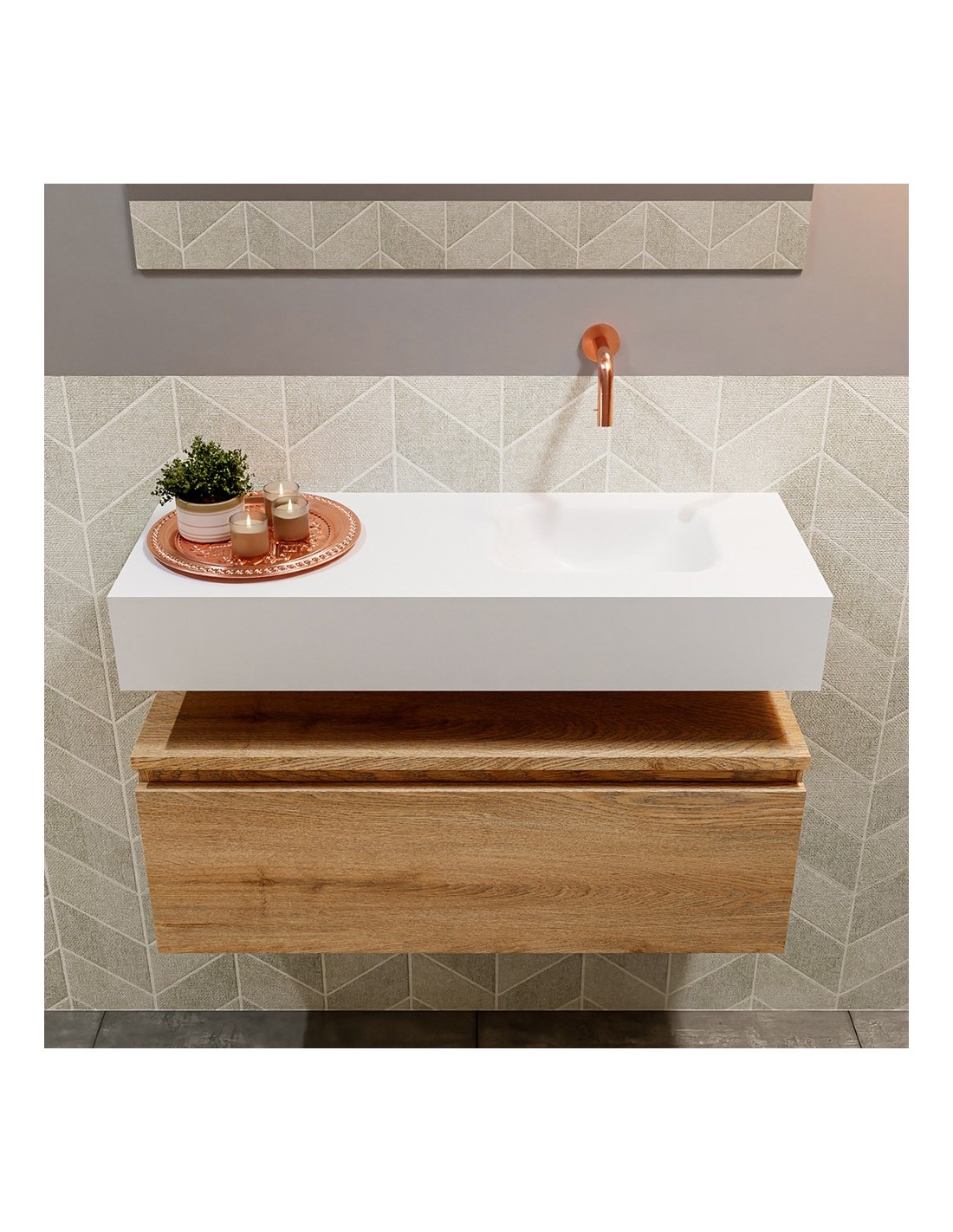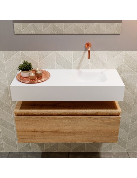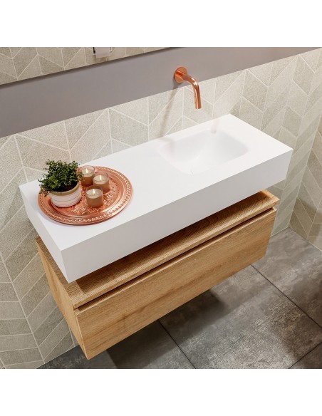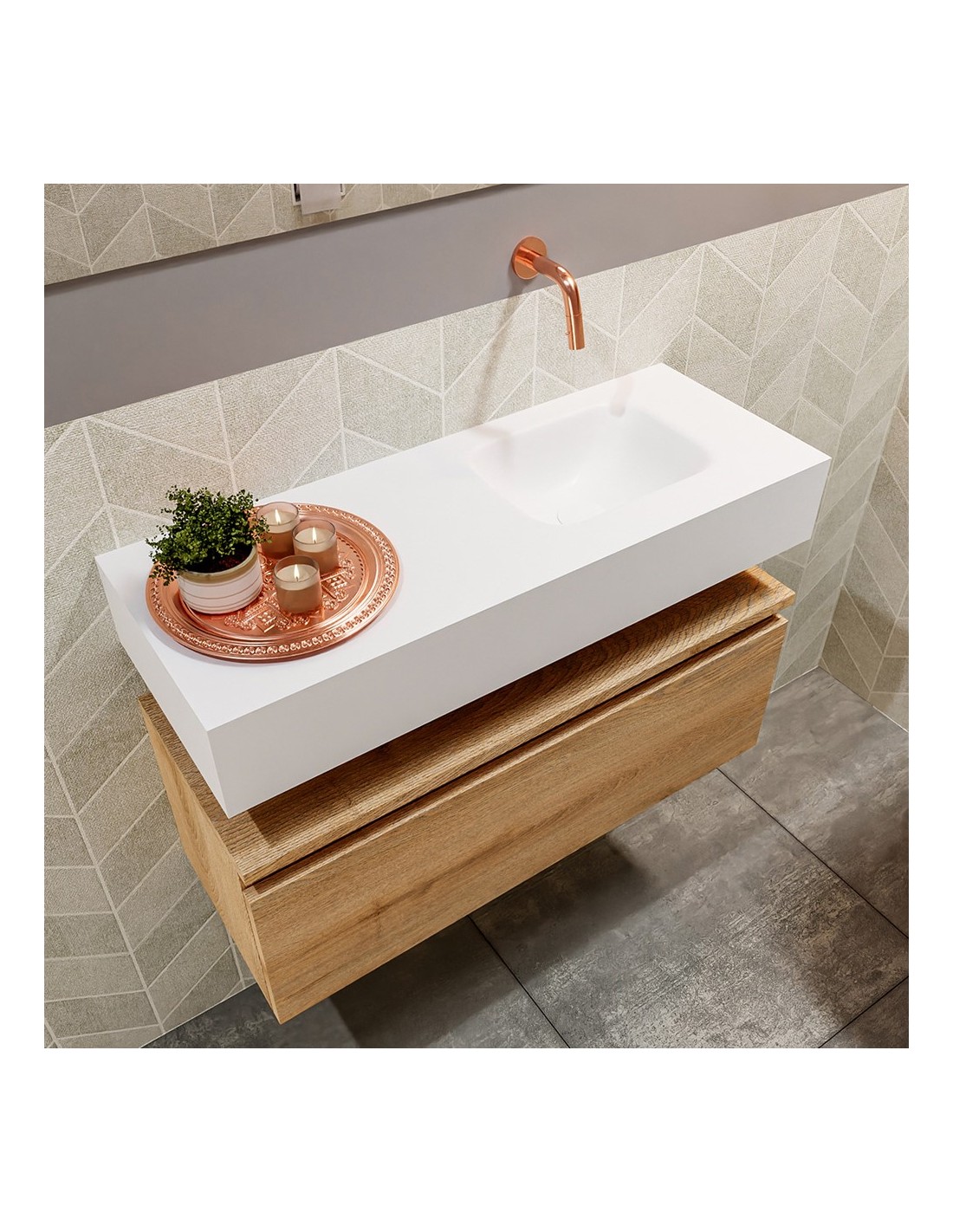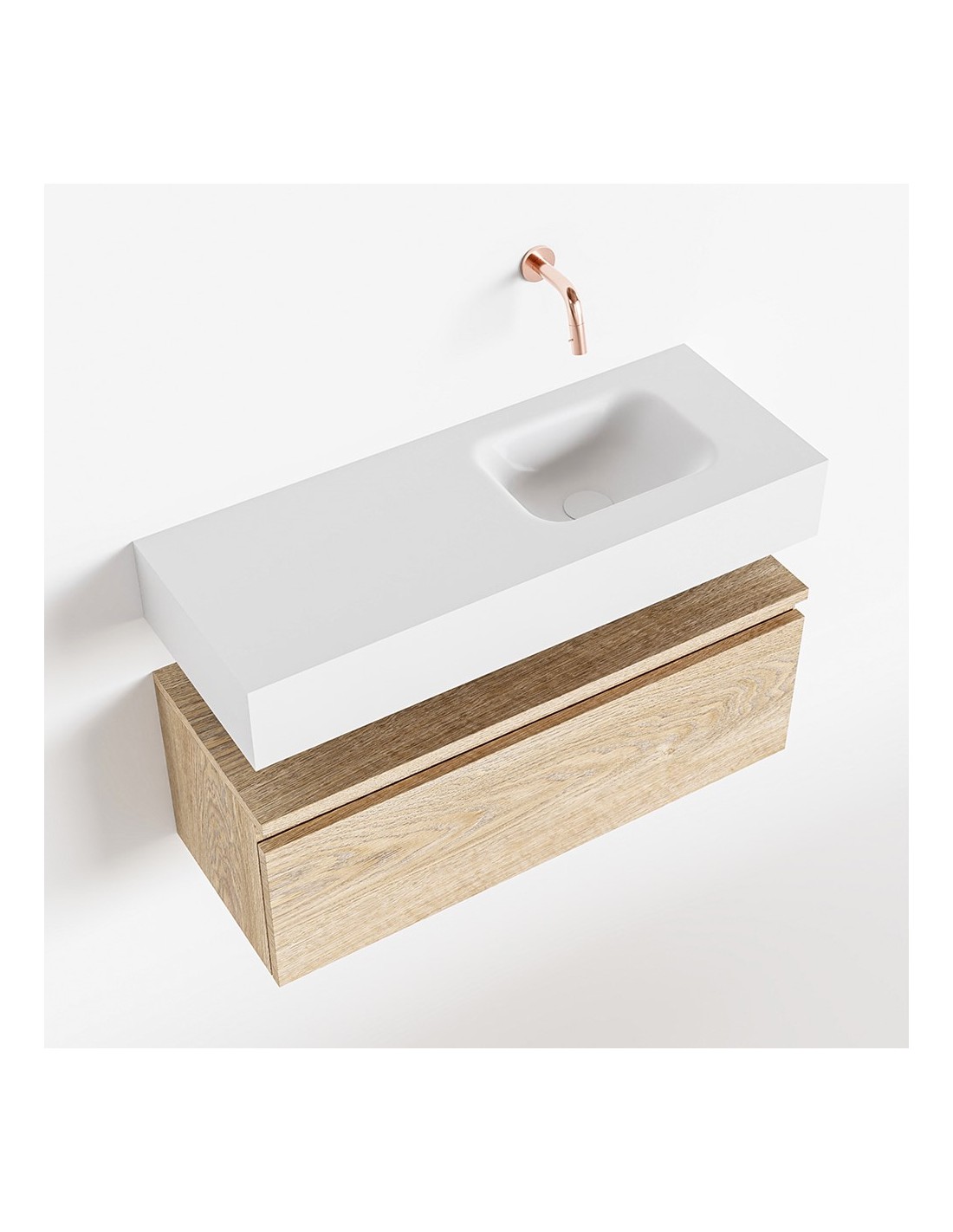 ANDOR Komplet badmiljø med højrevendt håndvask til vægmonteret armatur. Badmiljøet kommer med 1 skuffe med fuldt udtræk, og er fremstillet i MDF med design af vasket eg. Håndvasken er fremstillet i talkumsfarvet (mat hvid) solid surface. Badmiljøet måler 80 cm i bredden. Det viste armatur medfølger ikke i sættet.