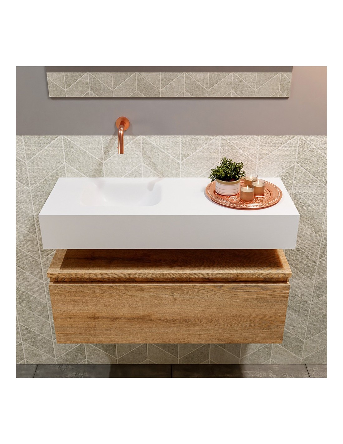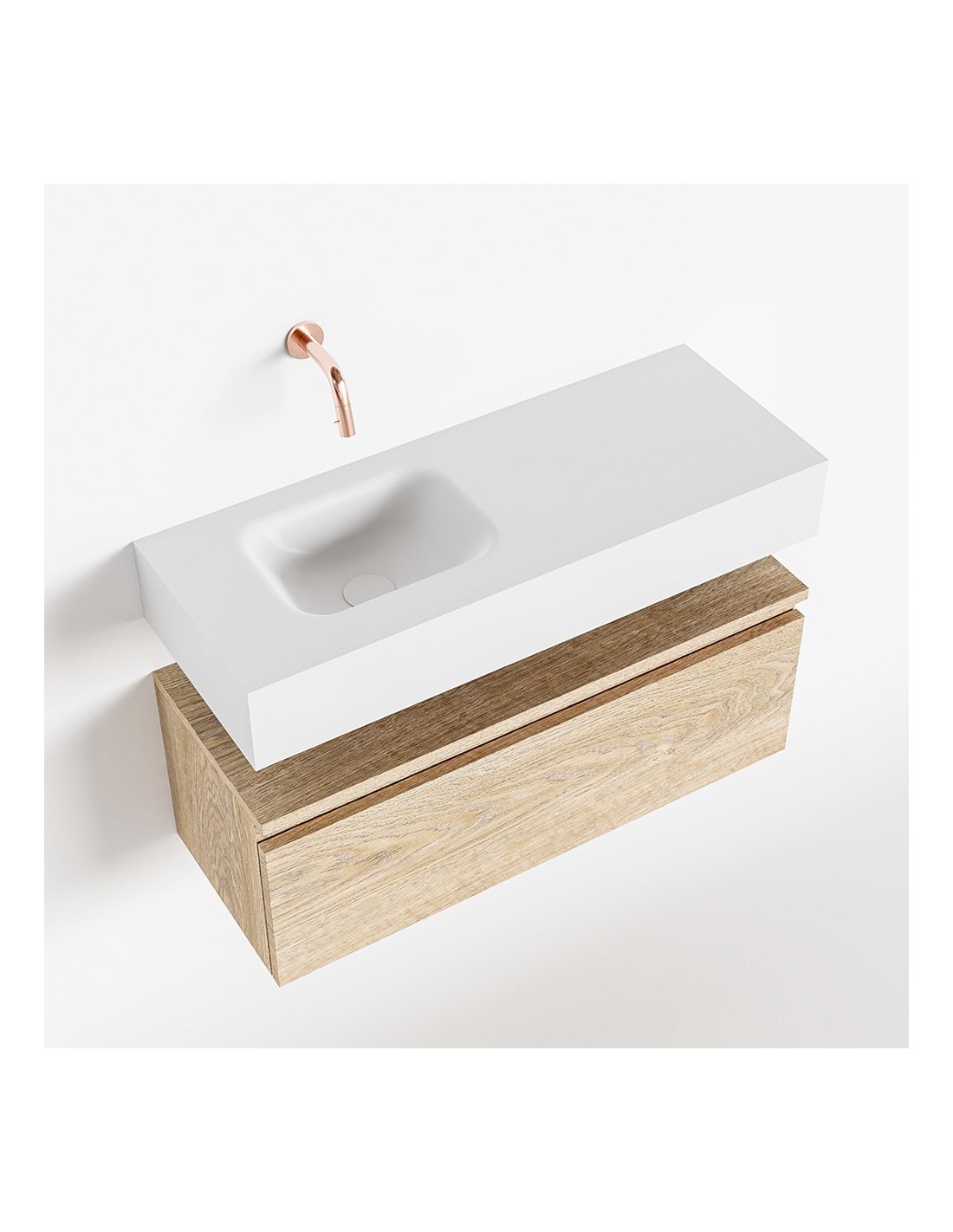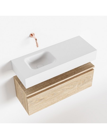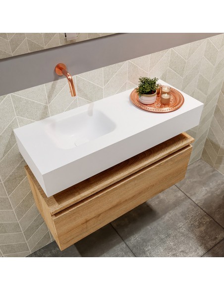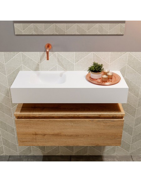 ANDOR Komplet badmiljø med venstrevendt håndvask til vægmonteret armatur. Badmiljøet kommer med 1 skuffe med fuldt udtræk, og er fremstillet i MDF med design af vasket eg. Håndvasken er fremstillet i talkumsfarvet (mat hvid) solid surface. Badmiljøet måler 80 cm i bredden. Det viste armatur medfølger ikke i sættet.
