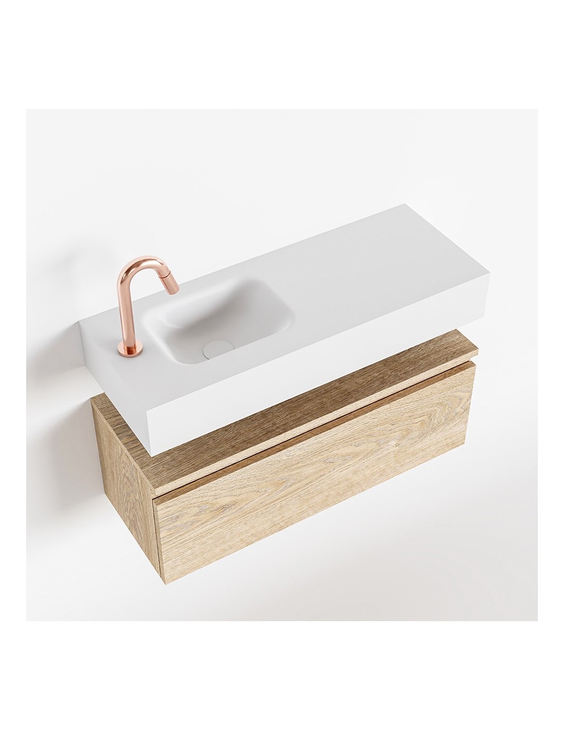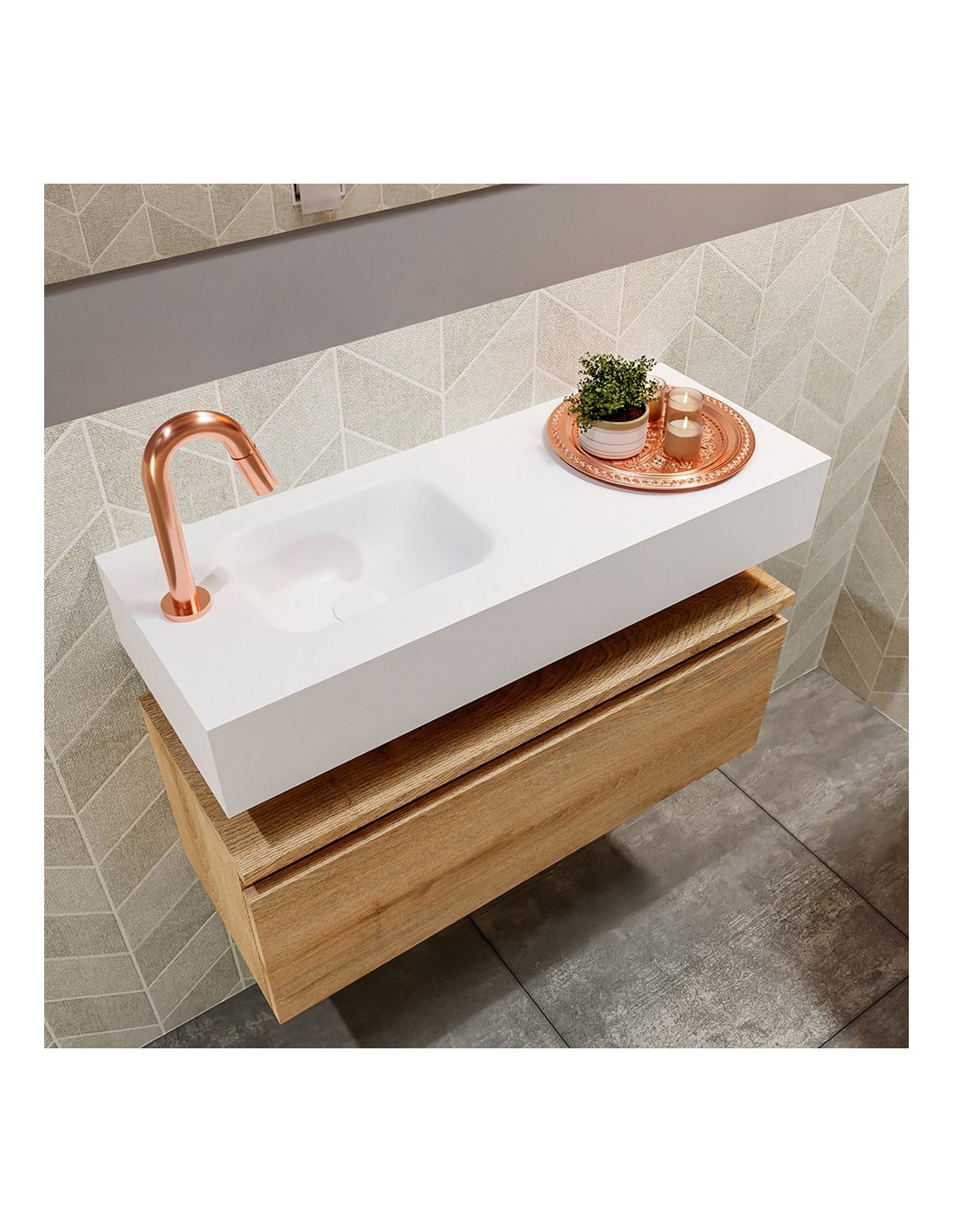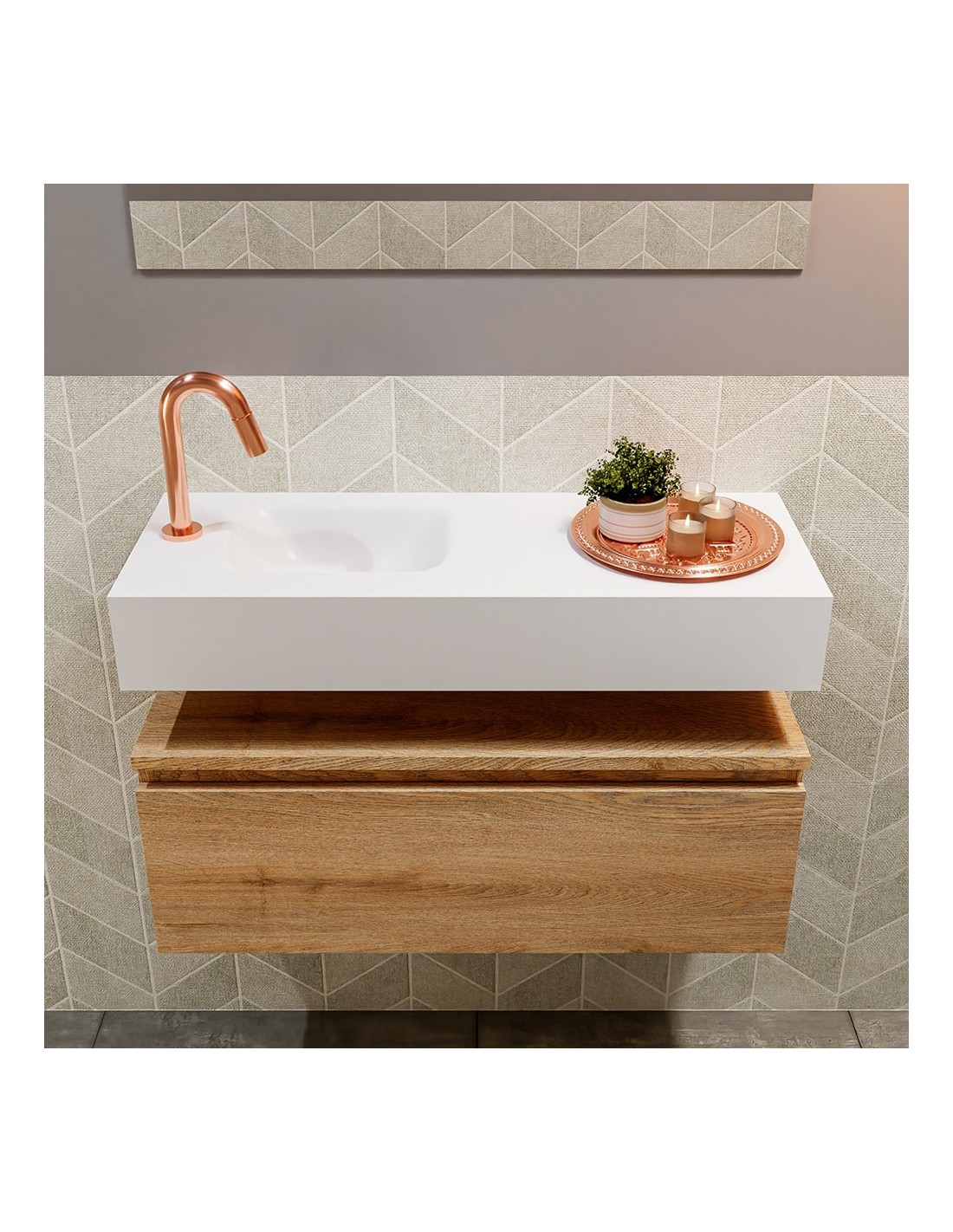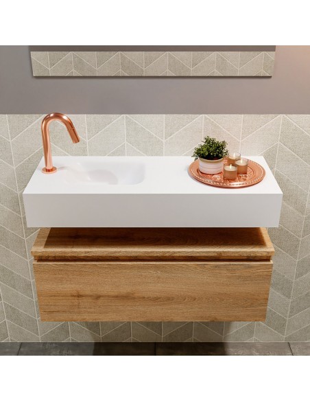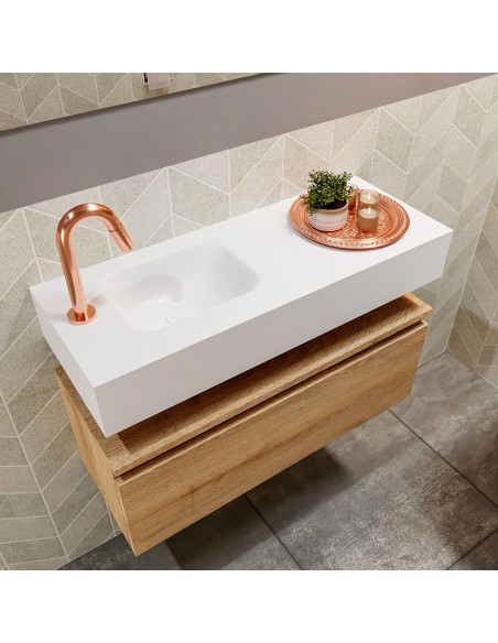 ANDOR Komplet badmiljø med venstrevendt håndvask til bordmonteret armatur. Badmiljøet kommer med 1 skuffe med fuldt udtræk, og er fremstillet i MDF med design af vasket eg. Håndvasken er fremstillet i talkumsfarvet (mat hvid) solid surface. Badmiljøet måler 80 cm i bredden. Det viste armatur medfølger ikke i sættet.