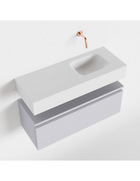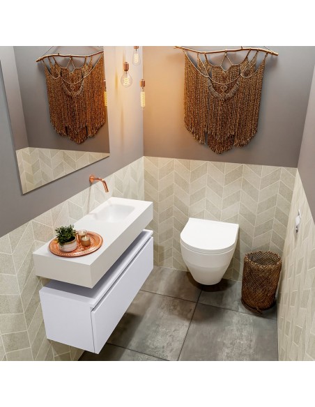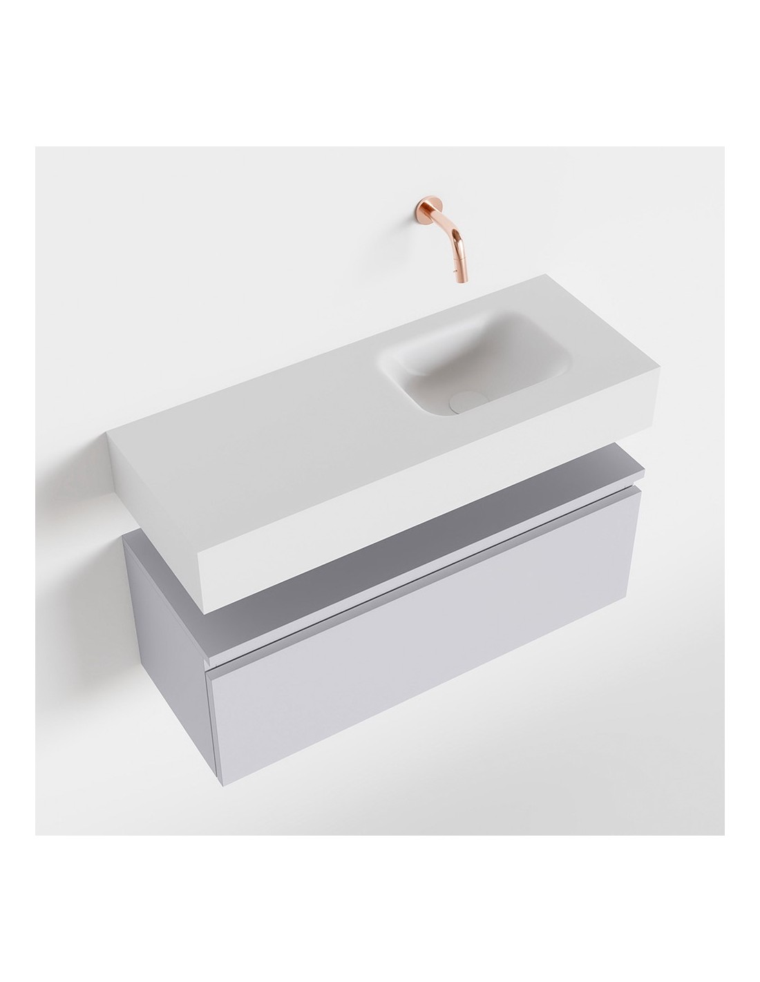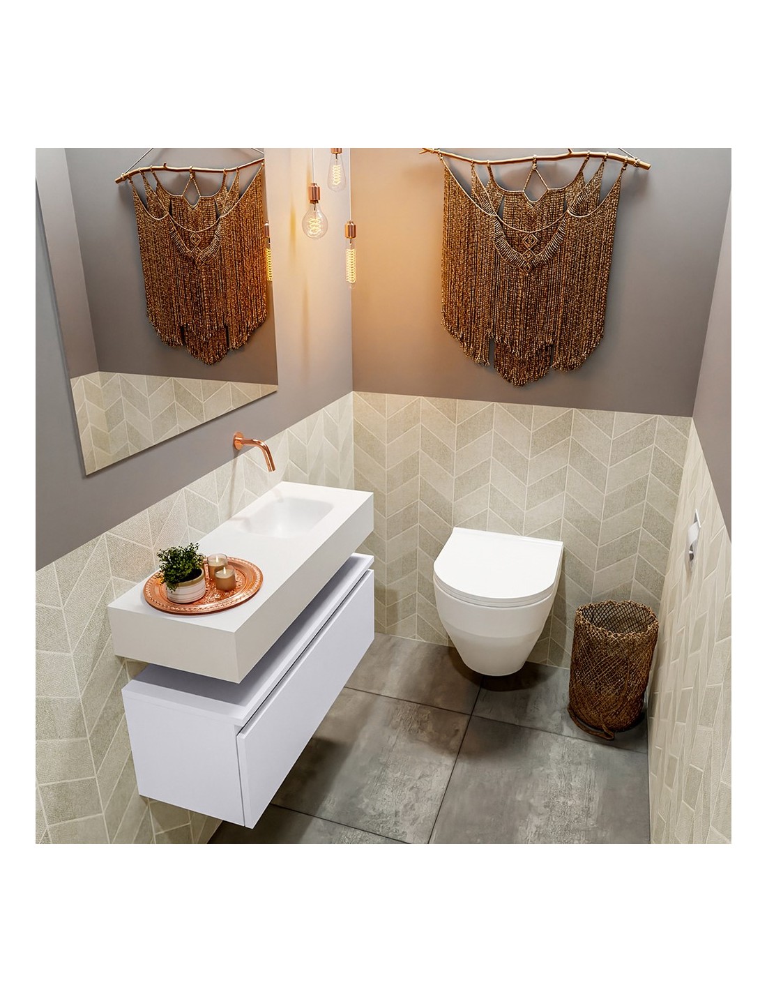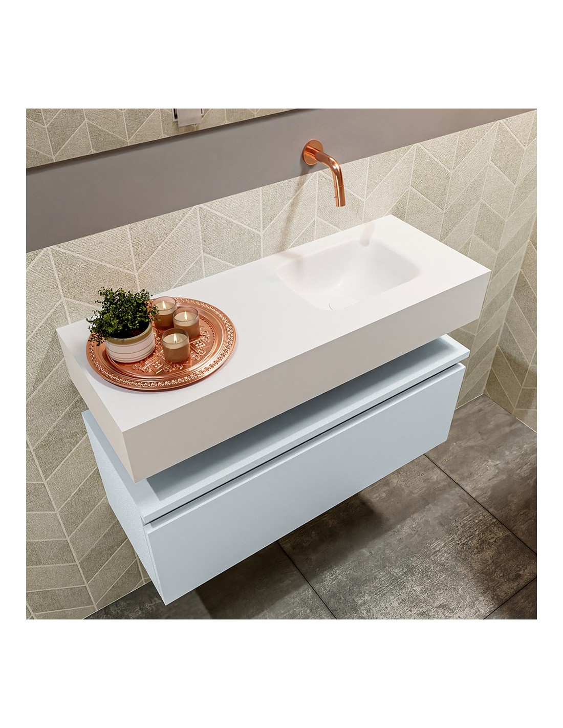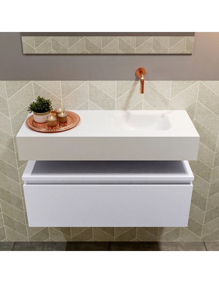 ANDOR Komplet badmiljø med højrevendt håndvask til vægmonteret armatur. Badmiljøet kommer med 1 skuffe med fuldt udtræk, og er fremstillet i MDF. Håndvasken er fremstillet i talkumsfarvet (mat hvid) solid surface. Badmiljøet måler 80 cm i bredden. Det viste armatur medfølger ikke i sættet.