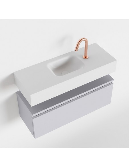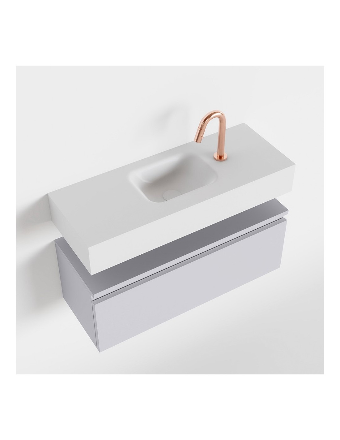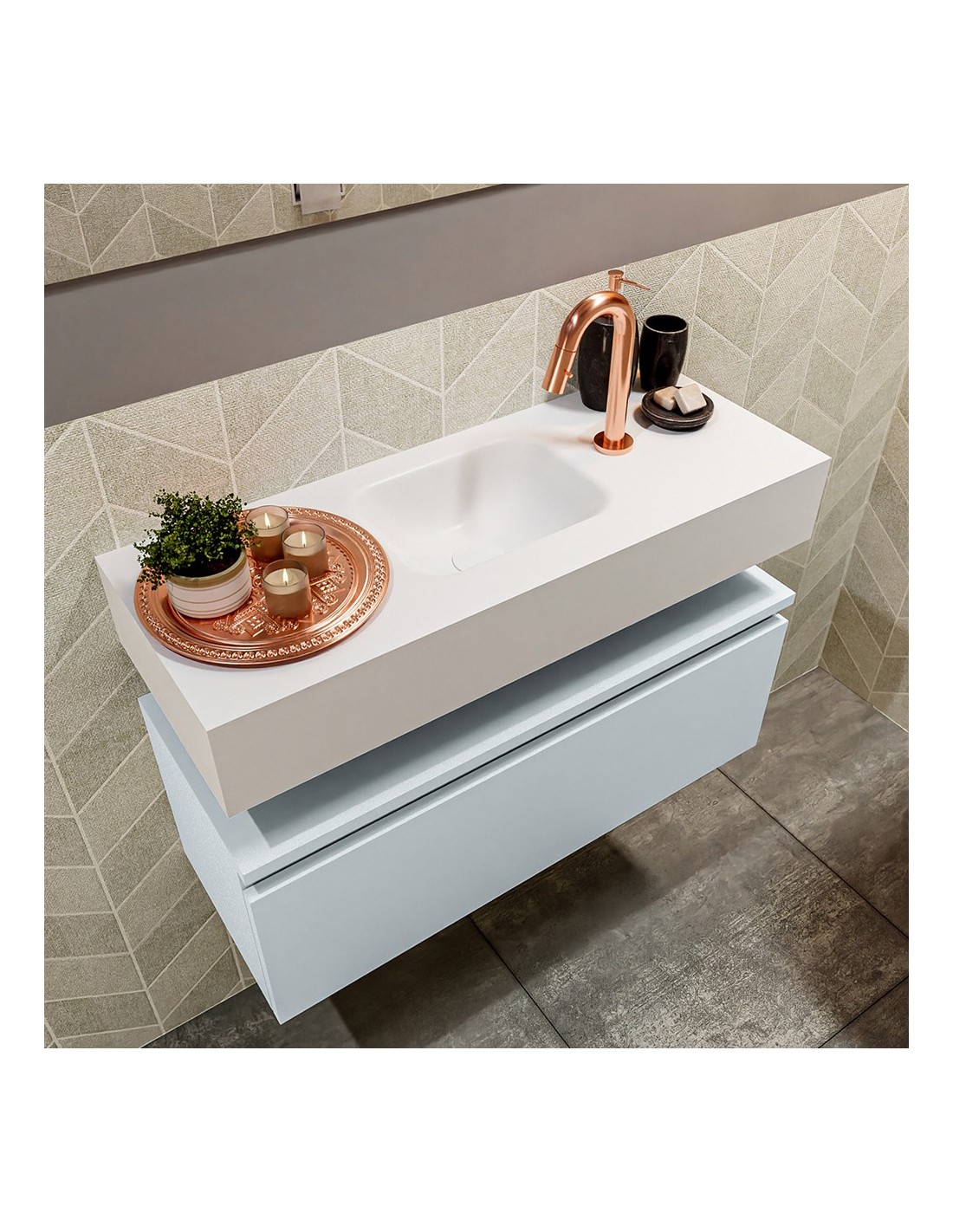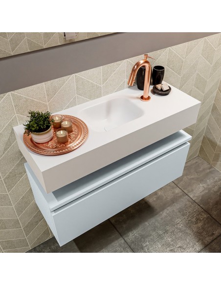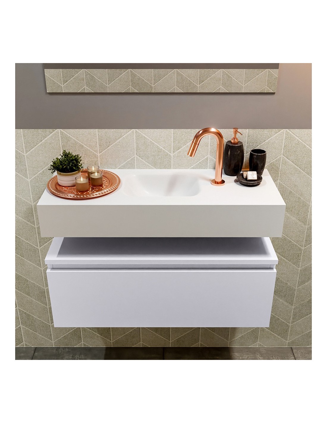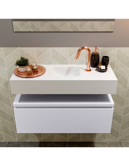 ANDOR Komplet badmiljø med midt centreret håndvask til bordmonteret armatur. Badmiljøet kommer med 1 skuffe med fuldt udtræk, og er fremstillet i MDF. Håndvasken er fremstillet i talkumsfarvet (mat hvid) solid surface. Badmiljøet måler 80 cm i bredden. Det viste armatur medfølger ikke i sættet.