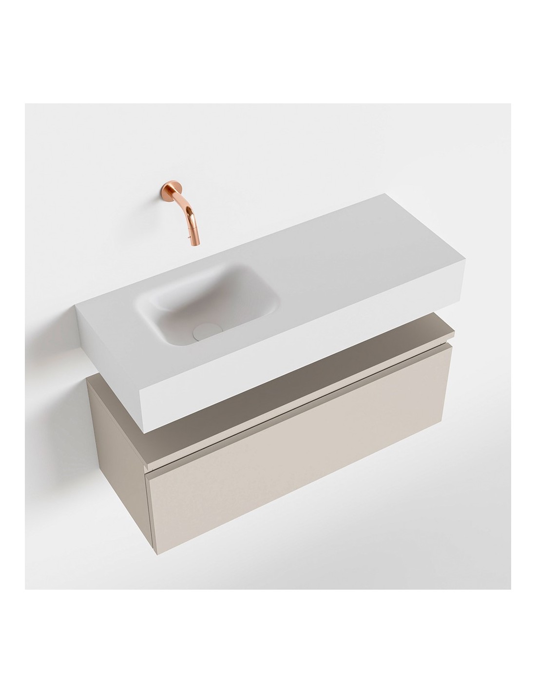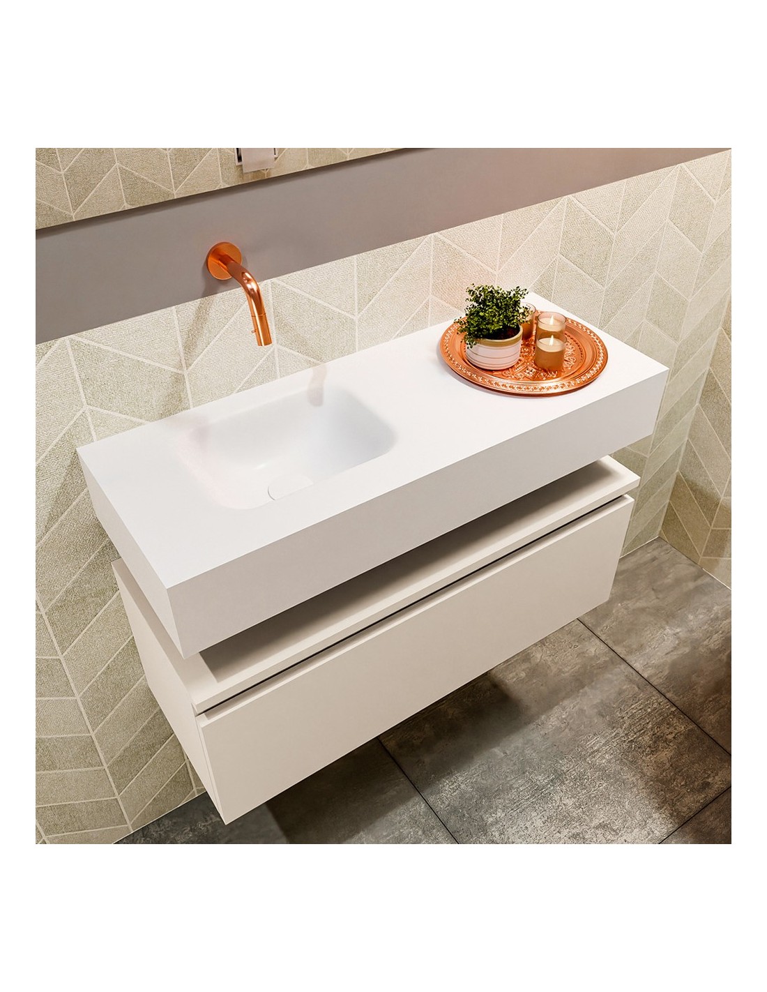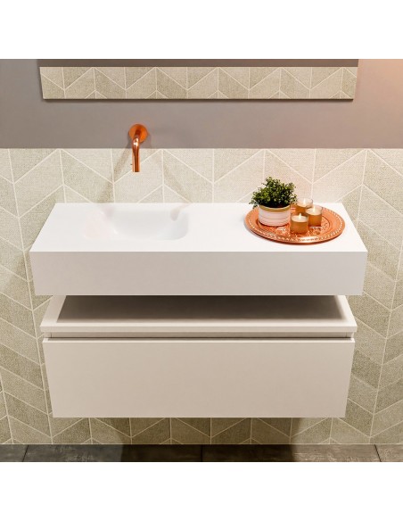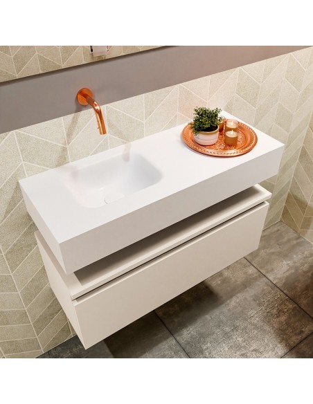 ANDOR Komplet badmiljø med venstrevendt håndvask til vægmonteret armatur. Badmiljøet kommer med 1 skuffe med fuldt udtræk, og er fremstillet i MDF. Håndvasken er fremstillet i talkumsfarvet (mat hvid) solid surface. Badmiljøet måler 80 cm i bredden. Det viste armatur medfølger ikke i sættet.