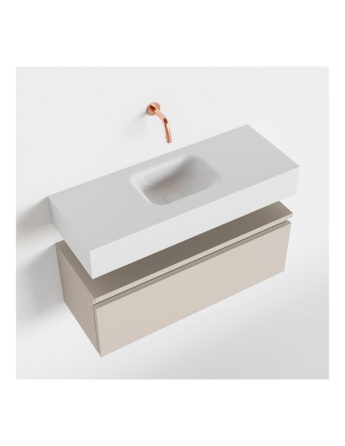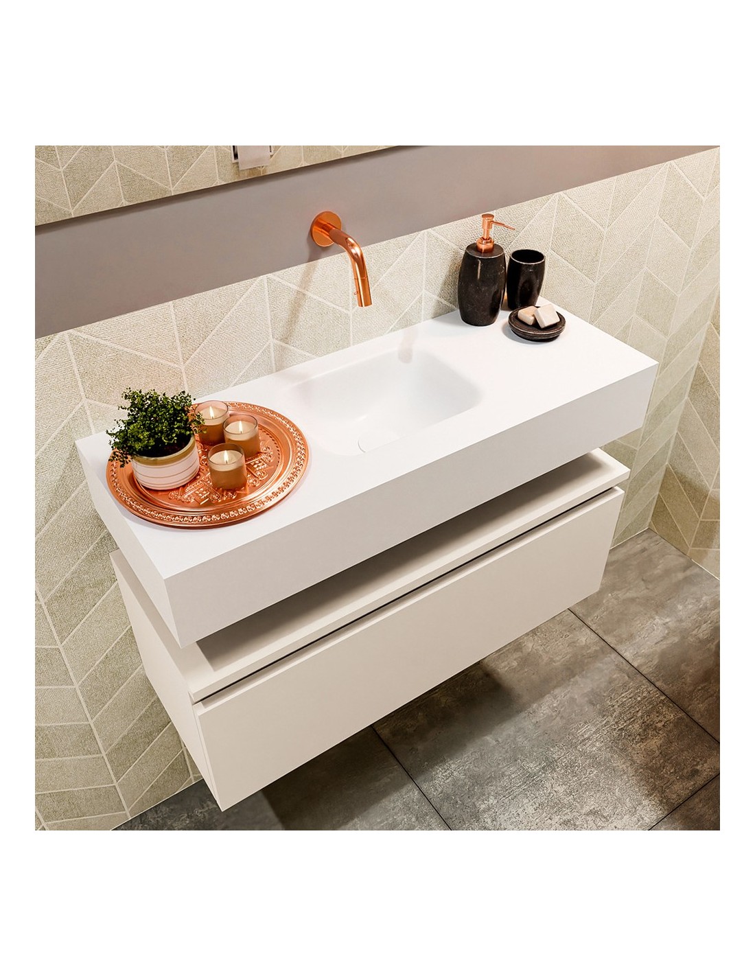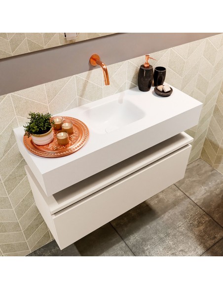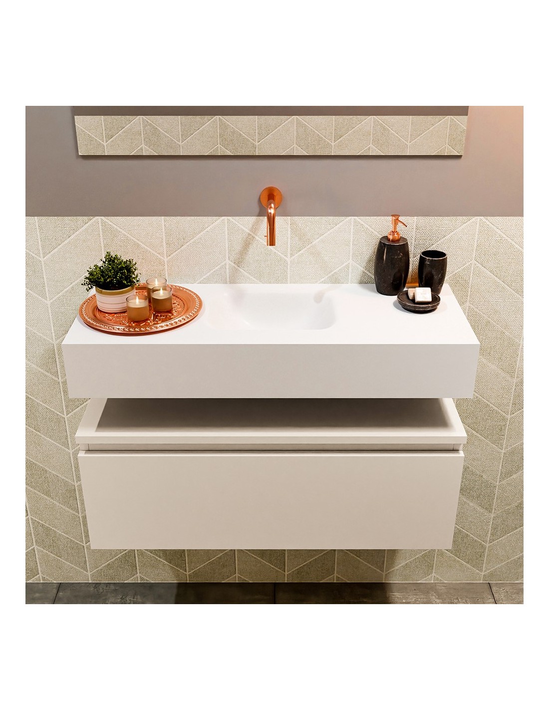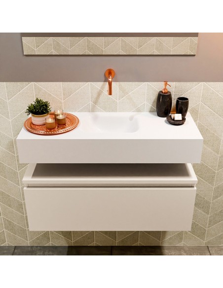 ANDOR Komplet badmiljø med midt centreret håndvask til vægmonteret armatur. Badmiljøet kommer med 1 skuffe med fuldt udtræk, og er fremstillet i MDF. Håndvasken er fremstillet i talkumsfarvet (mat hvid) solid surface. Badmiljøet måler 80 cm i bredden. Det viste armatur medfølger ikke i sættet.